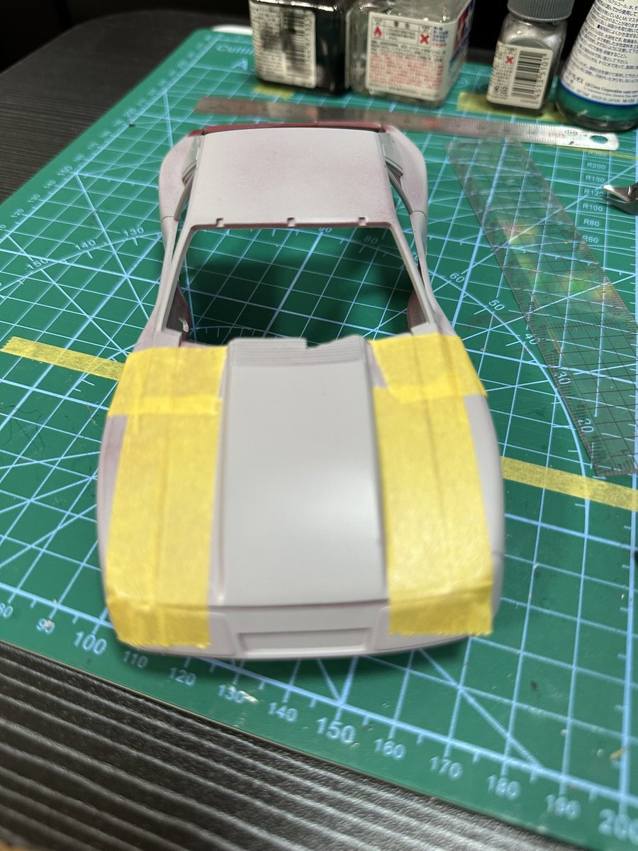 #Folgers_Mustang_GTO #IMSA   ボンネットはもう接着しちゃいました。 ボンネットピン他、突起も全部削り落としてスムージングしました。 pic.x.com/xIvSKc86e2