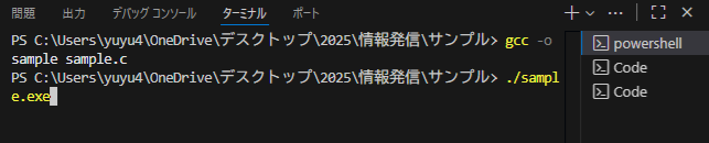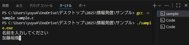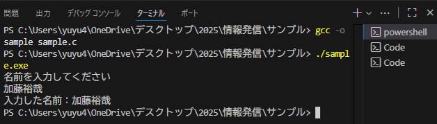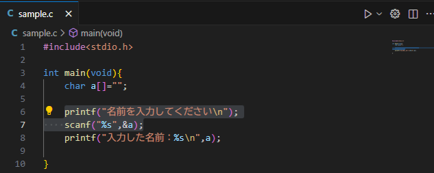 #35【C言語】入力 金曜日はC言語の日です。 C言語における入力を実行する説明します。 1.実践 ①「VSCode」を起動します。「sample.c」という名前でファイルを作成します。("sample"の部分はどんな名前でもいいです) ②1~10行目に #include<stdio.h> int main(void){ char a[]=""; pic.x.com/hxuH80J8ZT