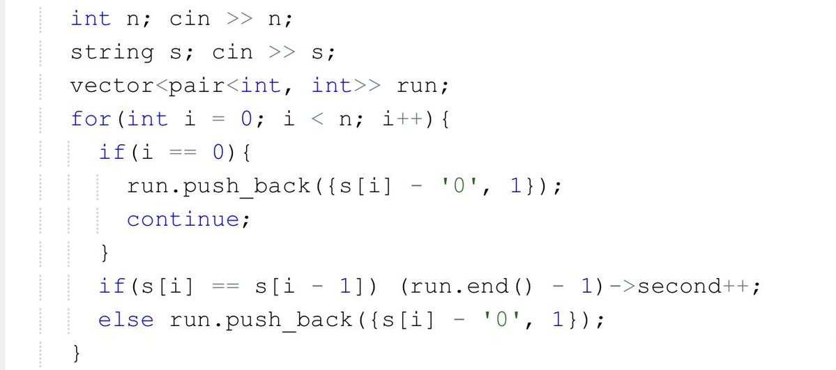 idがaqua_lengthのくせして今更だが、書くか。 n=inputi(); inputs(s,-1); char run[NMAX]; int length[NMAX]; int j; for(int i=j=0;i<n;j++){ char c=s[i]; len=0; do{i++;len++;}while(i<size&&c==a[i]); run[j]=c; length[j]=len; } n=j; #include #pragma x.com/masp_3/status/…
