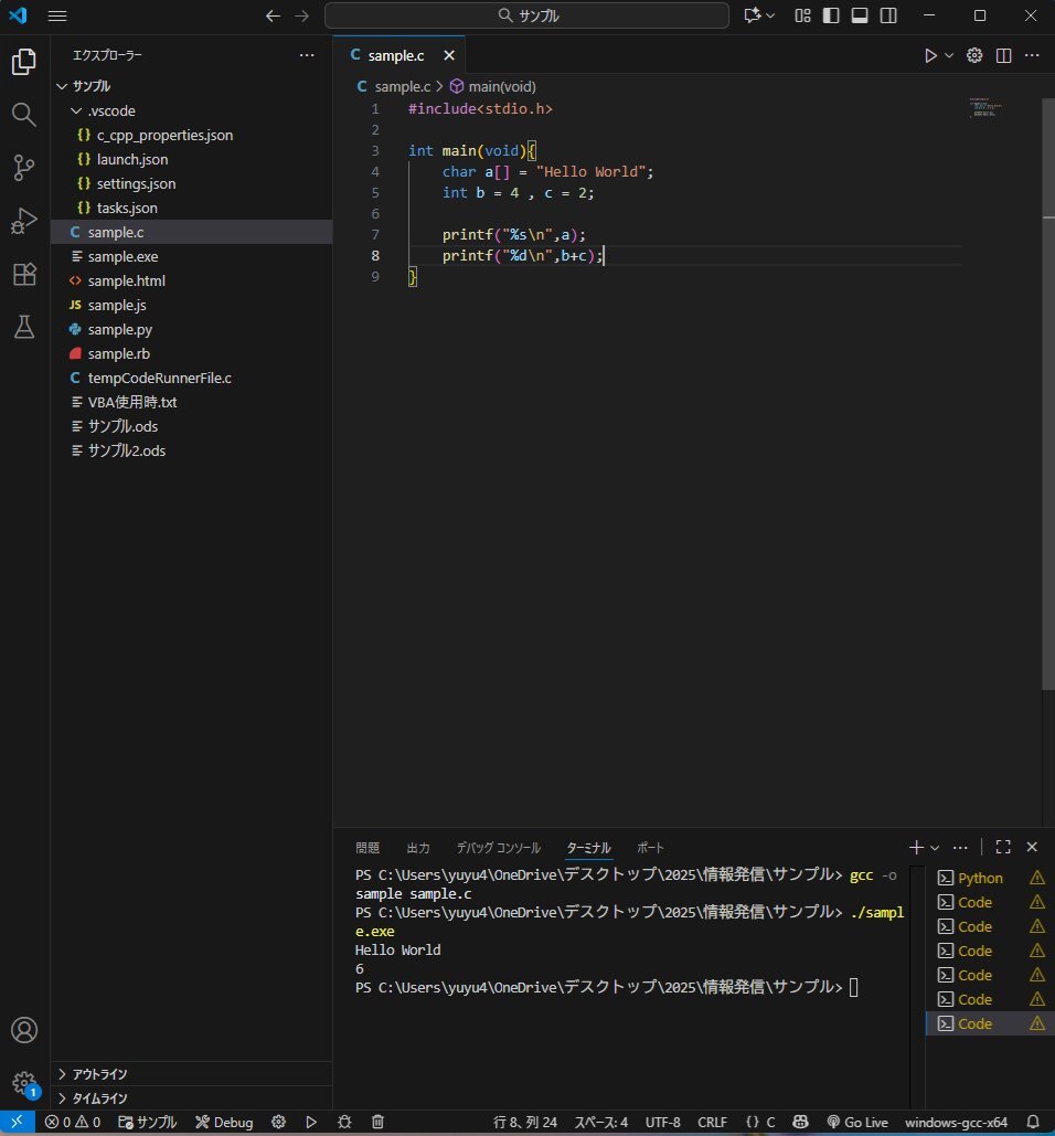 #28【C言語】変数 金曜日はC言語の日です。 C言語における変数を実行する説明します。 1.実践 ①「VSCode」を起動します。「sample.c」という名前でファイルを作成します。("sample"の部分はどんな名前でもいいです) ②1~9行目に「 #include<stdio.h> int main(void){ char a[] = "Hello pic.x.com/UruqgyyHSB