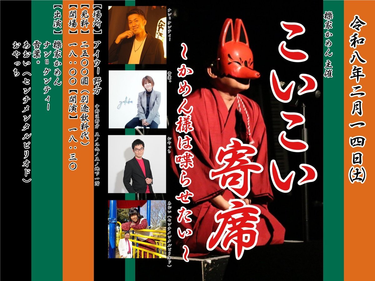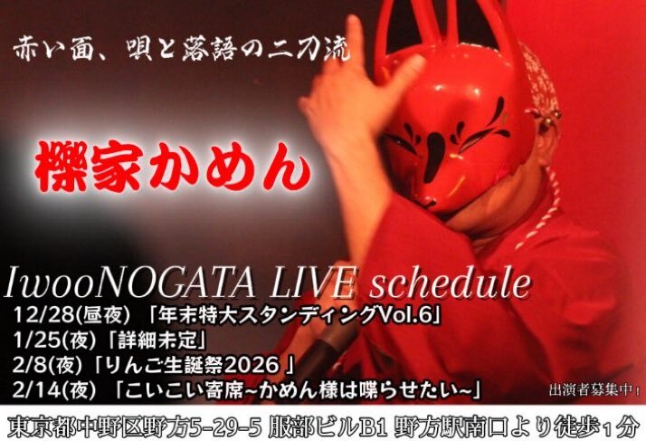 かめんの #IwooNOGATA 予定だよ! 年明けは1月25日から、そして2月14日はお待ちかねの主催ライブ「こいこい寄席~かめん様は喋らせたい~」がっ!! 御楽しみに〜♪ヾ(*´∀`*)ノ pic.x.com/PaZ2wm4FKe x.com/kurrachi/statu…