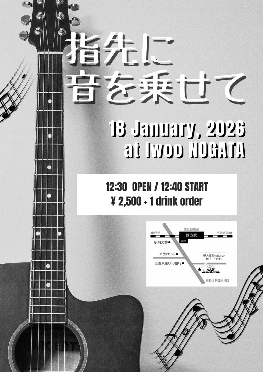 2025/12/14(日昼) 「指先に音を乗せて」 OPEN 12:30 START 12:50 CHARGE ¥2,500(ドリンク代別) act モリシンゴ 北村正裕 ハギワラケント #IwooNOGATA