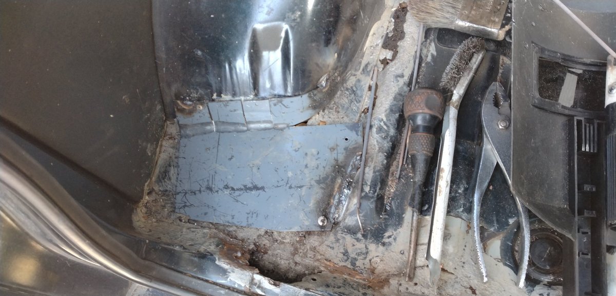 腐ったフロアをいい加減に溶接で塞いでいく 使いにくい家庭用溶接機にイライラしながら半日 鉄板切って 溶接して 錆転換剤剤塗ってを順繰りまわす 溶接機が止まるから 完了出来ず仮復旧したけど、これでもドタドタ鳴っていた振動が収まった。 #JA11 pic.x.com/50xnOf9sZm
