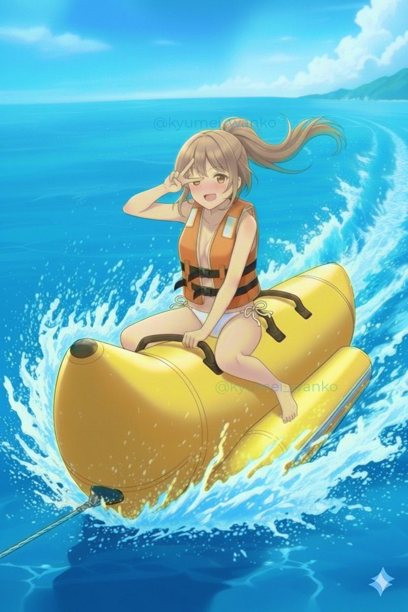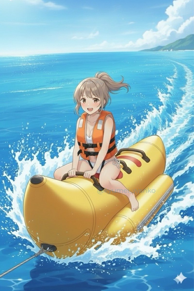 おはようございます☀️ 今日はバナナボートに挑戦するエナちゃん🍌🌊✨ 今日は絶対、落ちないもんっ!🛟✨ 嶋羽エナ日記009 #嶋羽エナ日記 #AIイラスト #AIart #Life #Jacket pic.x.com/6eYHQx5oGh