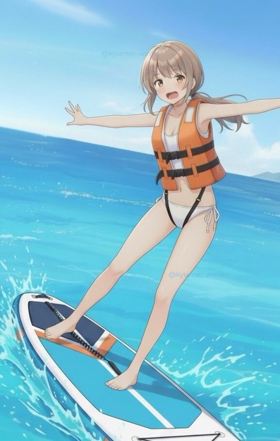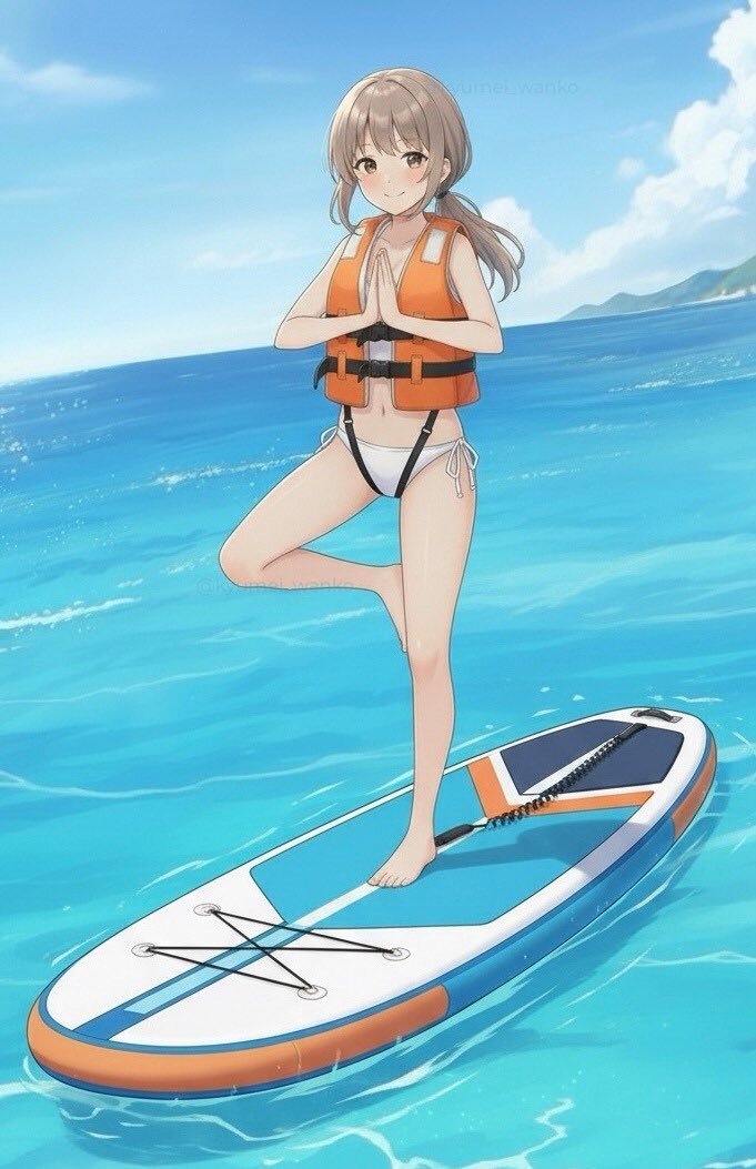 おはようございます☀️ 今日はSUPヨガの続き〜🧘‍♀️🌿 意外とバランスとるの難しいんだよねぇ〜💦 や、ヤバっ……!!💦 嶋羽エナ日記014 #嶋羽エナ日記 #AIイラスト #AIart #life #jacket pic.x.com/oi3cJdWjmU