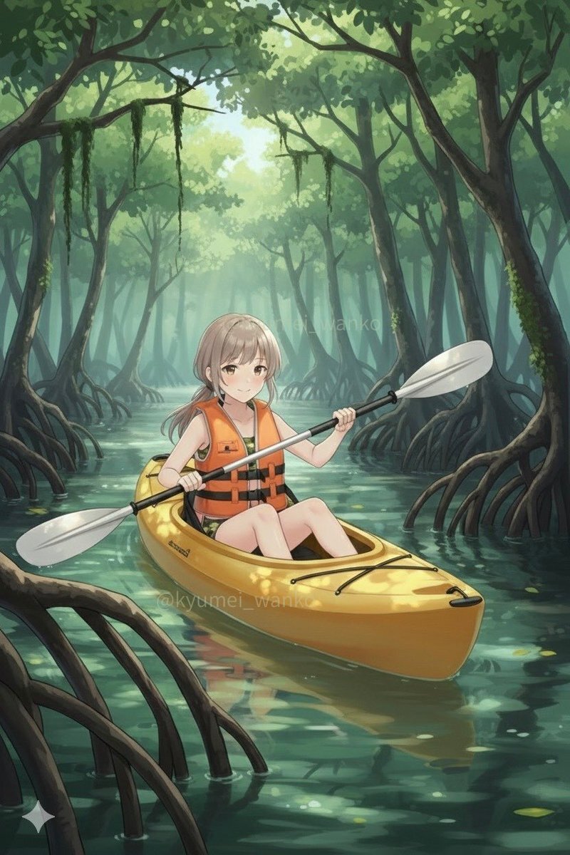 おはようございます〜🌞 今日はマングローブ林でカヤック体験!🛶✨ 朝の匂いがしてワクワクする〜🌿 嶋羽エナ日記007 #嶋羽エナ日記 #AIイラスト #AIart #life #jacket pic.x.com/Vg87utyMYU
