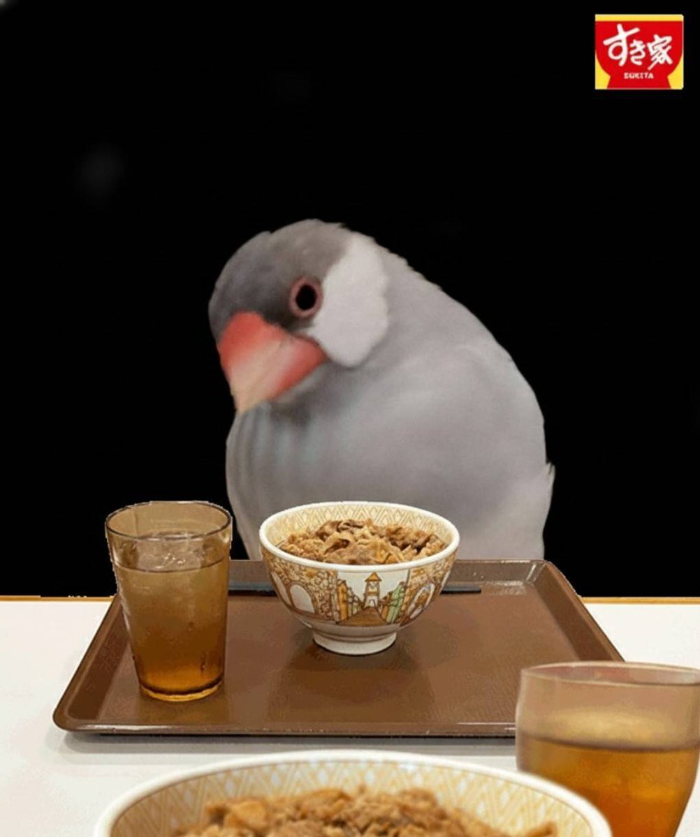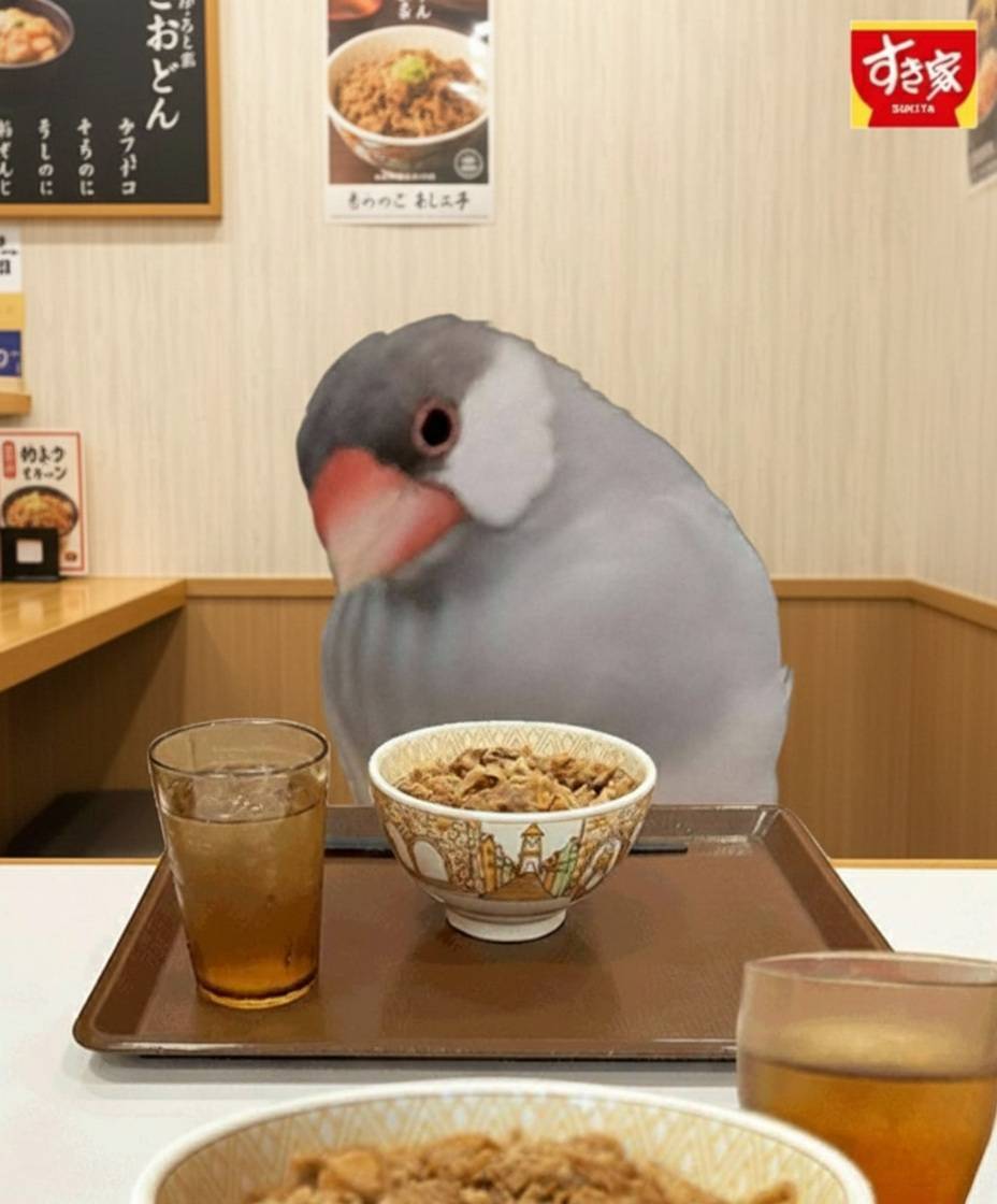 背景を、より牛丼屋さんぽく変更してみました……🤣❣️ #文鳥 #小鳥のいる暮らし #すき家 #javasparrow #小鳥 #癒し pic.x.com/56FxfNmxm2