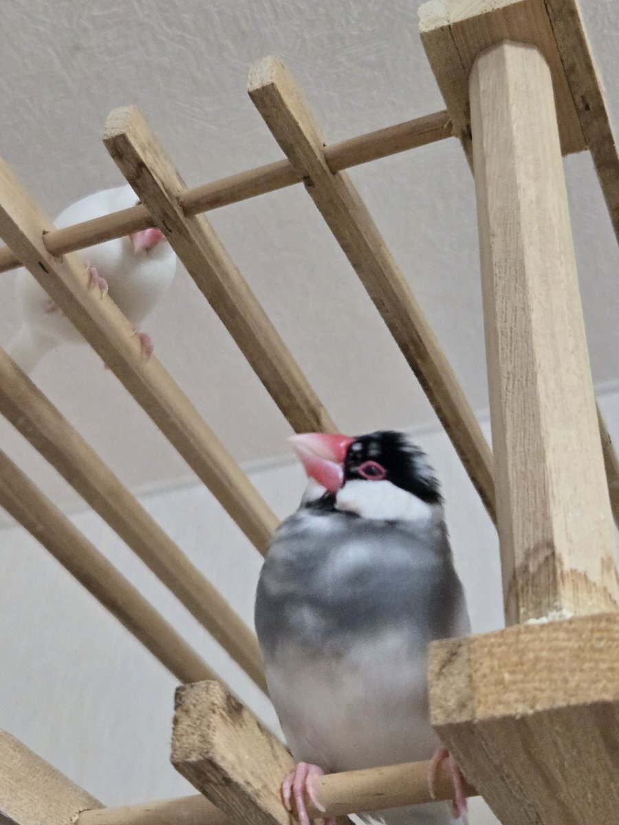 セカンドハウスから追い出し、1羽でマッタリ過ごしてました🩷 同じ♀️文鳥でも年長者のラプさんはセカンドハウス内には一度も脚を踏み入れた事が無く、外からの覗き専門です…🤣 それぞれの個性、楽しみ方があり様子を見てると面白いです🤗❣️ #文鳥 #小鳥のいる暮らし #javasparrow #小鳥 #癒し