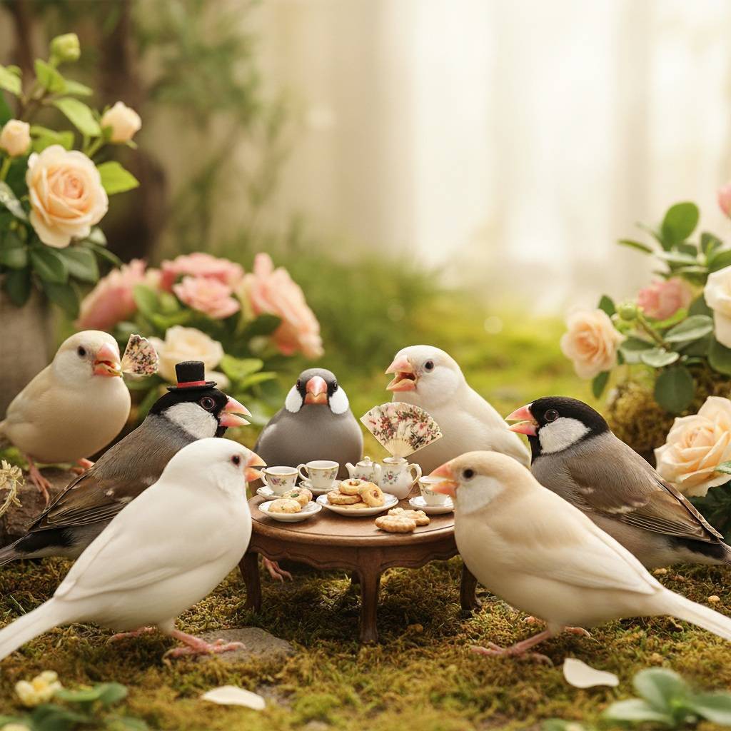 愉快に楽しく🎶 愛らしい文鳥たちの茶話会風景です❣️ #文鳥 #小鳥のいる暮らし #ai画像 #かわいい #javasparrow #小鳥 #癒し pic.x.com/BSdeUUwUUi