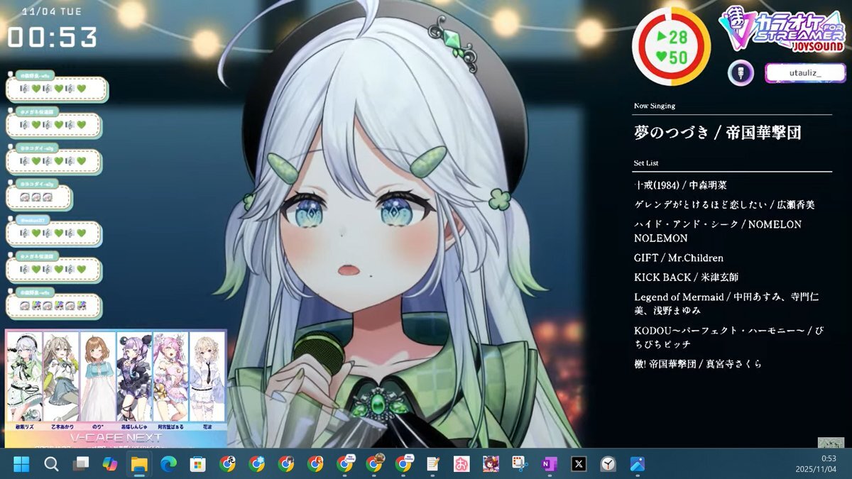 歌唄リズの同接30を目指す歌枠 配信中❗ 🖥youtu.be/hfFgU9jxH0E 7.KODOU ~パーフェクト・ハーモニー~ / 中田 あすみと寺門 仁美と浅野 まゆみ 8.檄!帝国華撃団 / 真宮寺さくら(横山智佐) 9.夢のつづき / 帝国華撃団 弾幕:🎼💚🎼💚🎼💚 #歌唄リズ #歌枠 #JPOP #アニソン pic.x.com/IACGJ6eRd9 x.com/UtaU_Liz/statu…