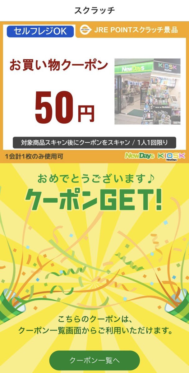 JR東日本のNewDaysアプリで50ポイントで抽選して50ポイントだった😢 有効期間が短いので要注意! クーポンを開いて確認して使用済みにしたら50ポイントが失うので要注意! #JRE #ポイント #クーポン #NewDays #JR東日本 #スクラッチ #KIOSK #ハズレ pic.x.com/8ONCCwm3OJ