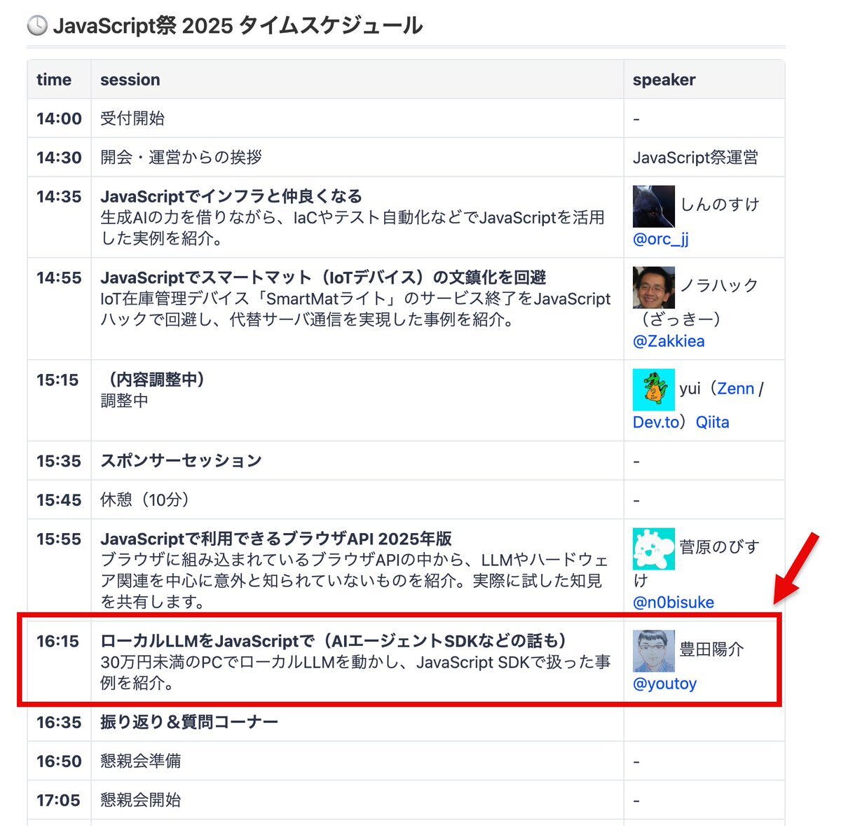 12/13(土)の午後に開催される #jsfes 登壇のお声がけをいただき、「ローカルLLMをJavaScriptで(AIエージェントSDKなどの話も)」という内容で登壇します! ●冬のJavaScript祭り@ Pleasanter Lounge - JavaScript祭り | Doorkeeper javascript-fes.doorkeeper.jp/events/192774