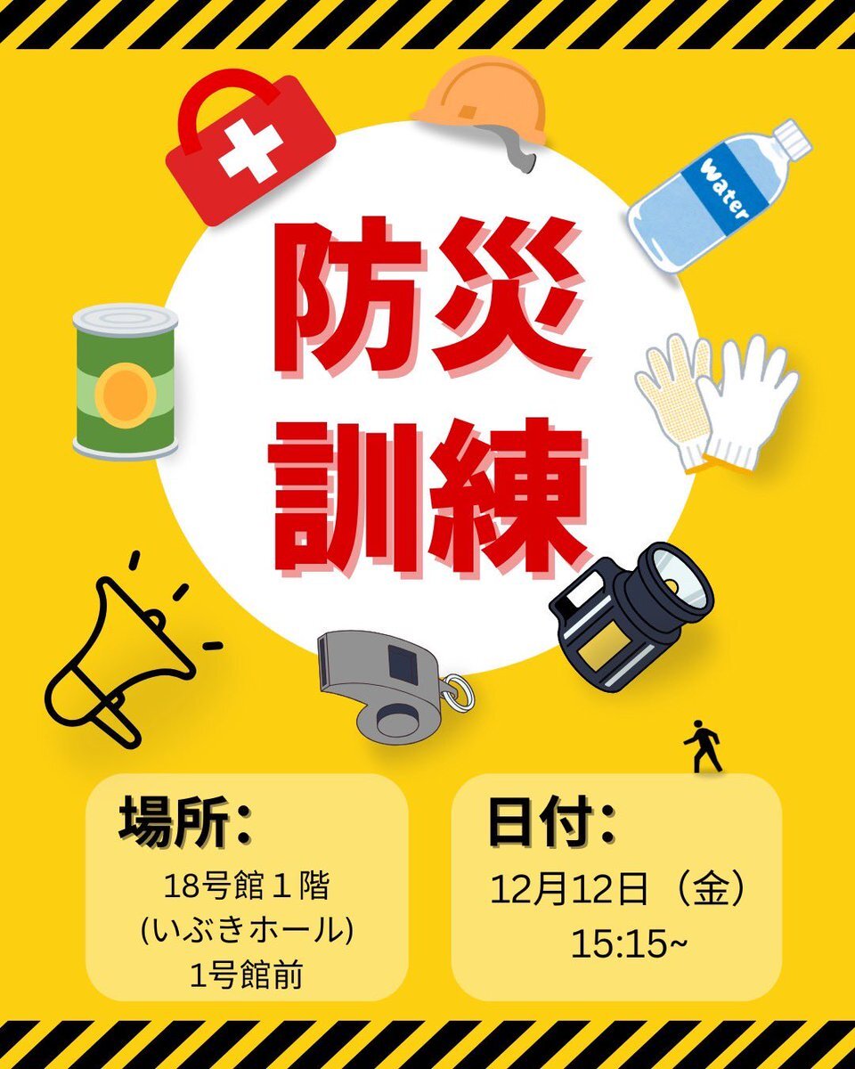 12/12(金) 15:15から、18号館1階いぶきホールで #防災訓練 を開催します!🦺⛑️ 八王子消防署・楢原出張所の皆さんが応急救護を教えてくれます🙌 参加してくれた方には非常食もプレゼント! 皆さんぜひ気軽にお越しください✨✨ #工学院大学 #工学院大学学生自治会常任委員会 #KUTE #kogakuin pic.x.com/zKgyaVMDSH