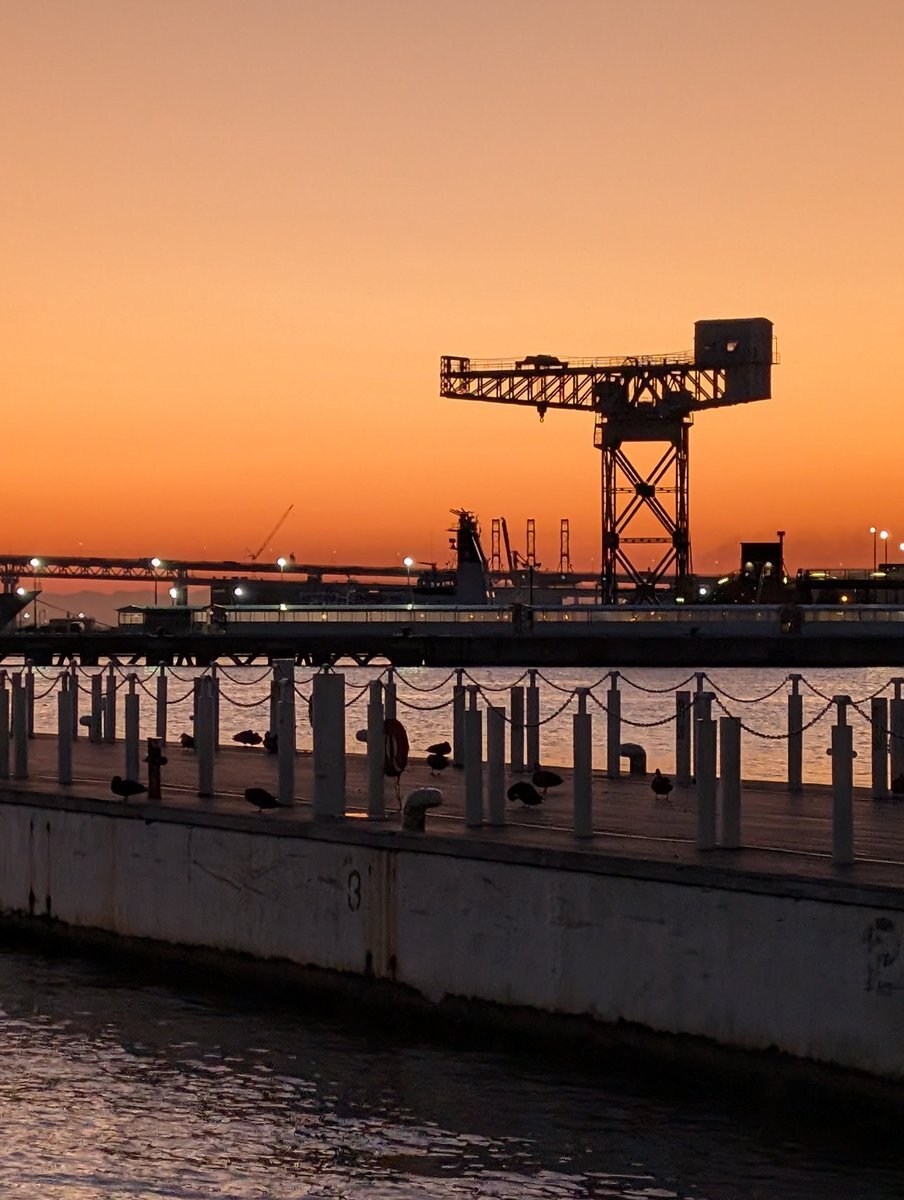 Gibson LesPaulのような燃えるような緋のグラデーションが美しい 大さん橋にはNorthern Phoenixの大きな煙突が見えました #ハンマーヘッド #横浜 #みなとみらい #朝の散歩 #朝の景色 #Gibson #LesPaul #緋色 #グラデーション #レッドサンバースト #大さん橋 #NorthernPhoenix #煙突 pic.x.com/BhauiqERBj