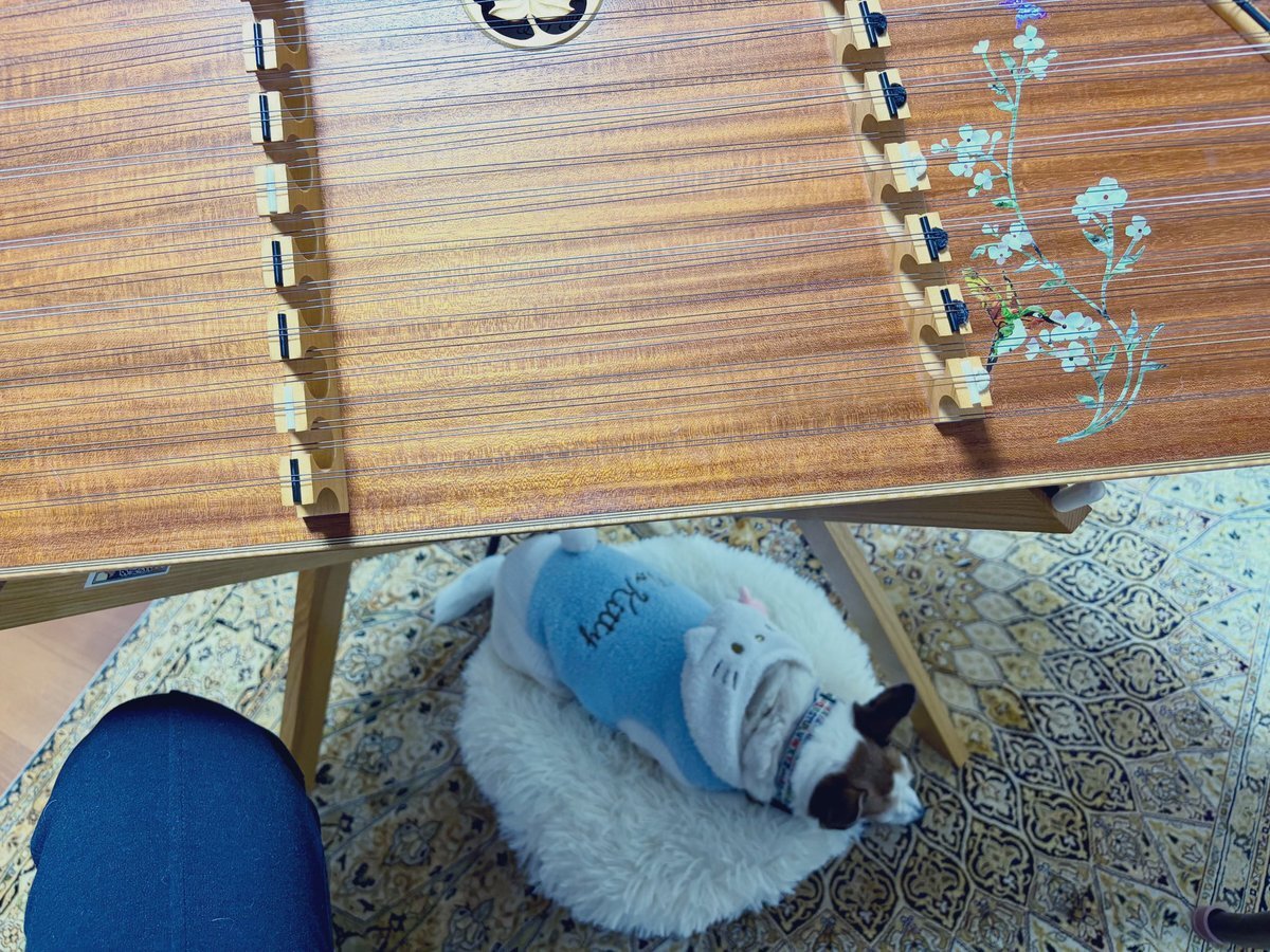 足元が冷えるからふかふかを敷いて練習しようと思ったら 犬が住み着いてしまった… #ハンマーダルシマー #犬のいる生活 #hammereddulcimer #lifewithdog pic.x.com/vyINkuBn3q