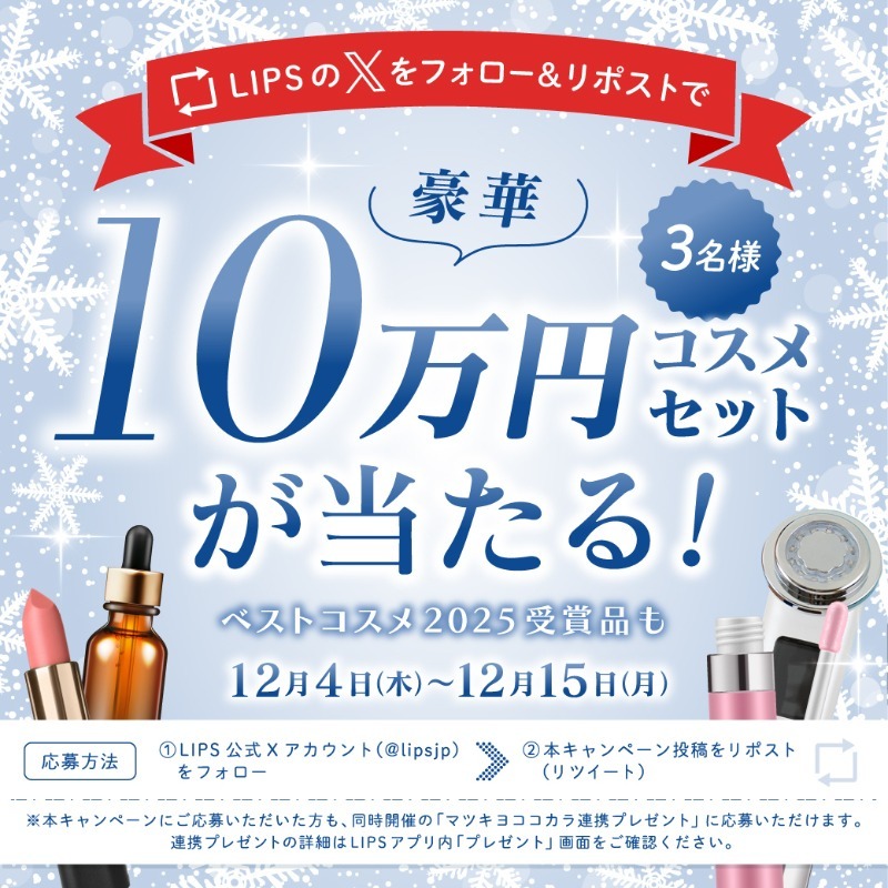 🎁✨豪華プレゼントキャンペーン開催✨🎁 フォロー&リポストで 10万円分のコスメセットが3名様に当たる! ベストコスメ2025受賞アイテムも入った豪華セットをゲットできるチャンス💄❄️ 開催期間は 12/4〜12/15⛄️ この冬、あなたに幸運が届きますように…🫧 #LIPS #プレゼント企画 #LIPSベスコス