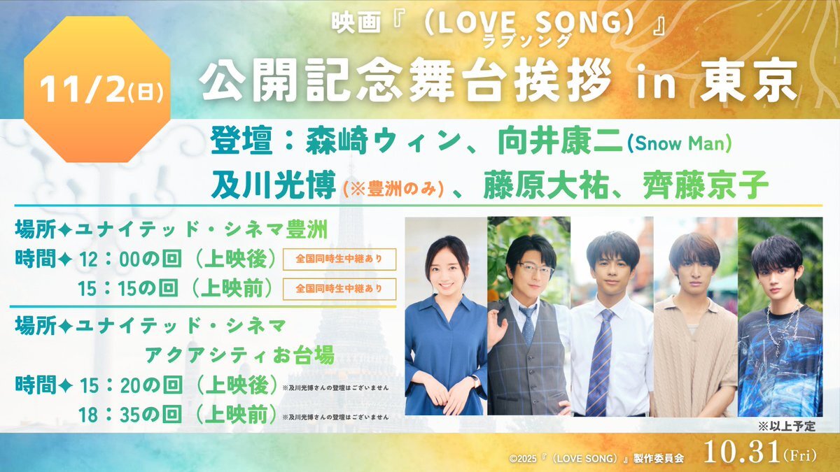 ✦┈┈┈┈┈┈┈┈┈┈┈┈✦ ⠀⠀⠀11/2(日) 開催決定🎊 ⠀ 公開記念舞台挨拶 𝑖𝑛 東京 ✦┈┈┈┈┈┈┈┈┈┈┈┈✦ ⠀ 📍ユナイテッド・シネマ豊洲 ①12:00の回 上映後/全国中継あり🎥ˊ˗ ②15:15の回 上映前/全国中継あり🎥ˊ˗ 登壇者: #森崎ウィン #向井康二 (#SnowMan) #及川光博 #藤原大祐