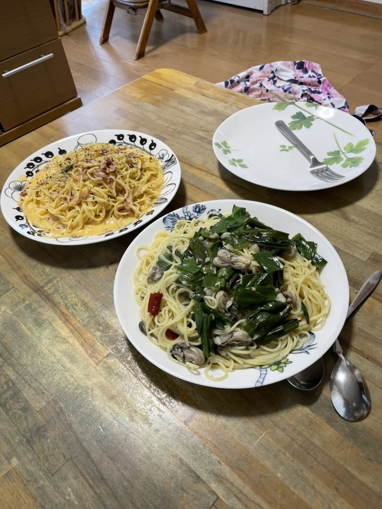 牡蠣と青ネギのパスタ、カルボナーラを作りました。 #pasta #lunch #パスタ #昼食 pic.x.com/DyzTWDw9G4