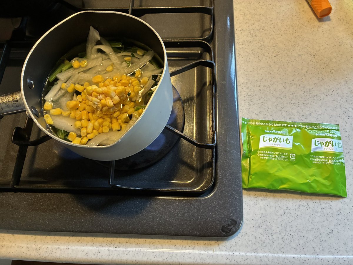 ポッカサッポロの「おうちスープ じゃがいも」を使ったほうれん草、コーン、玉ねぎのスープ。 これは見た目よりずっと美味しい。 結構こういう簡易スープの素は使えるかも #Lunch pic.x.com/WVsRCGnuBi