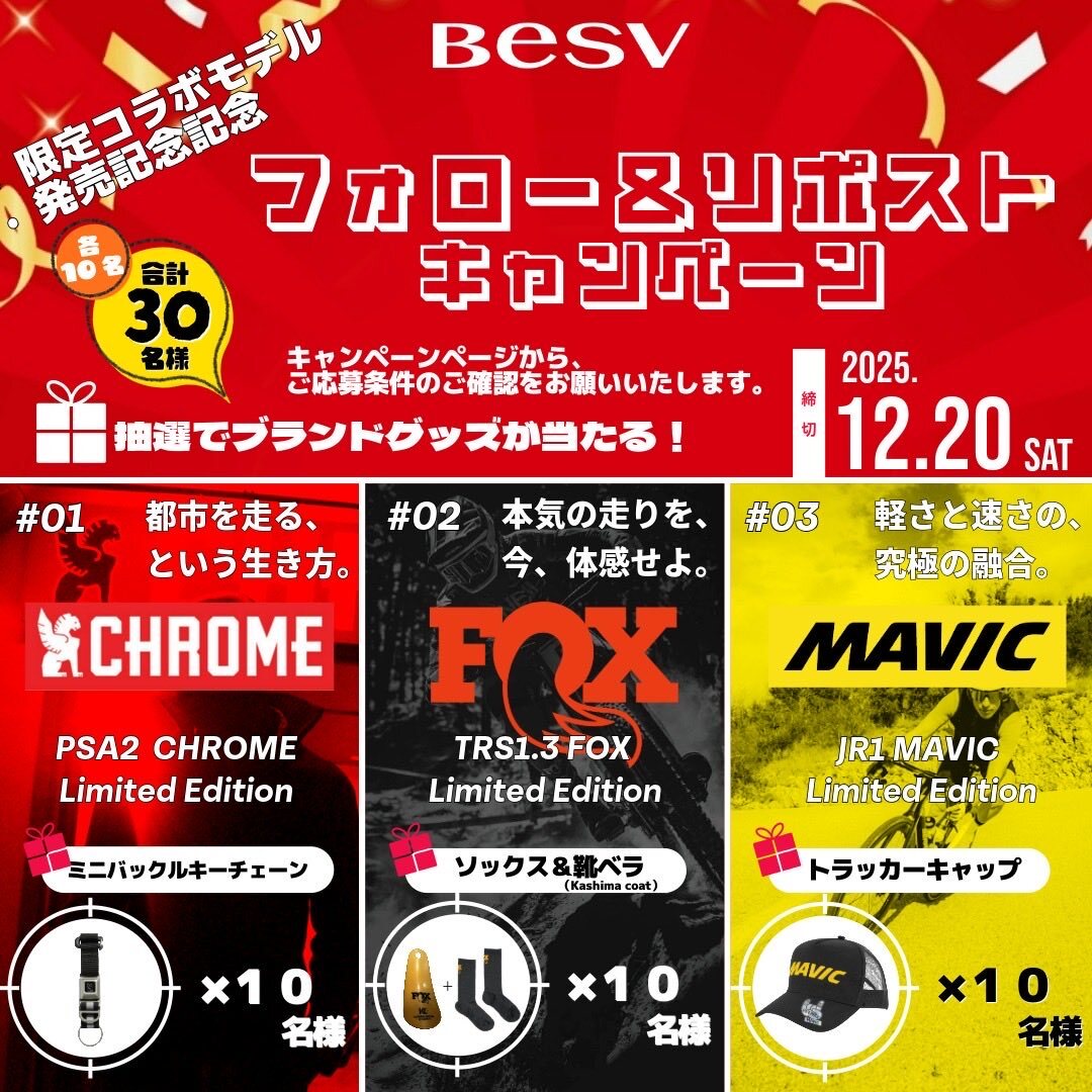 ━━━━━━━━━━━━━━━━━━ 《NEWS》 BESV限定コラボモデル記念キャンペーン ━━━━━━━━━━━━━━━━━━ BESV JAPANでは 『PSA2×CHROME(クローム)』 『TRS1.3×FOX(フォックス)』 『JR1×MAVIC(マヴィック)』 各限定コラボモデルの発売を記念して、 公式Xアカウントにて