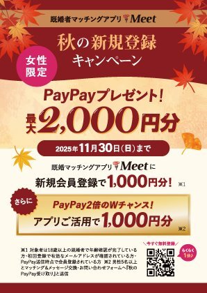 【女性限定】新規登録&アプリ活用で2,000円分プレゼント☆秋の新規登録キャンペーン開催♪既婚者アプリMeetに今すぐ無料登録▶️meet-up.jp/?AC=x #Meet #既婚者 #マッチングアプリ #婚外恋愛 #婚外 pic.x.com/FdWcfplUfX
