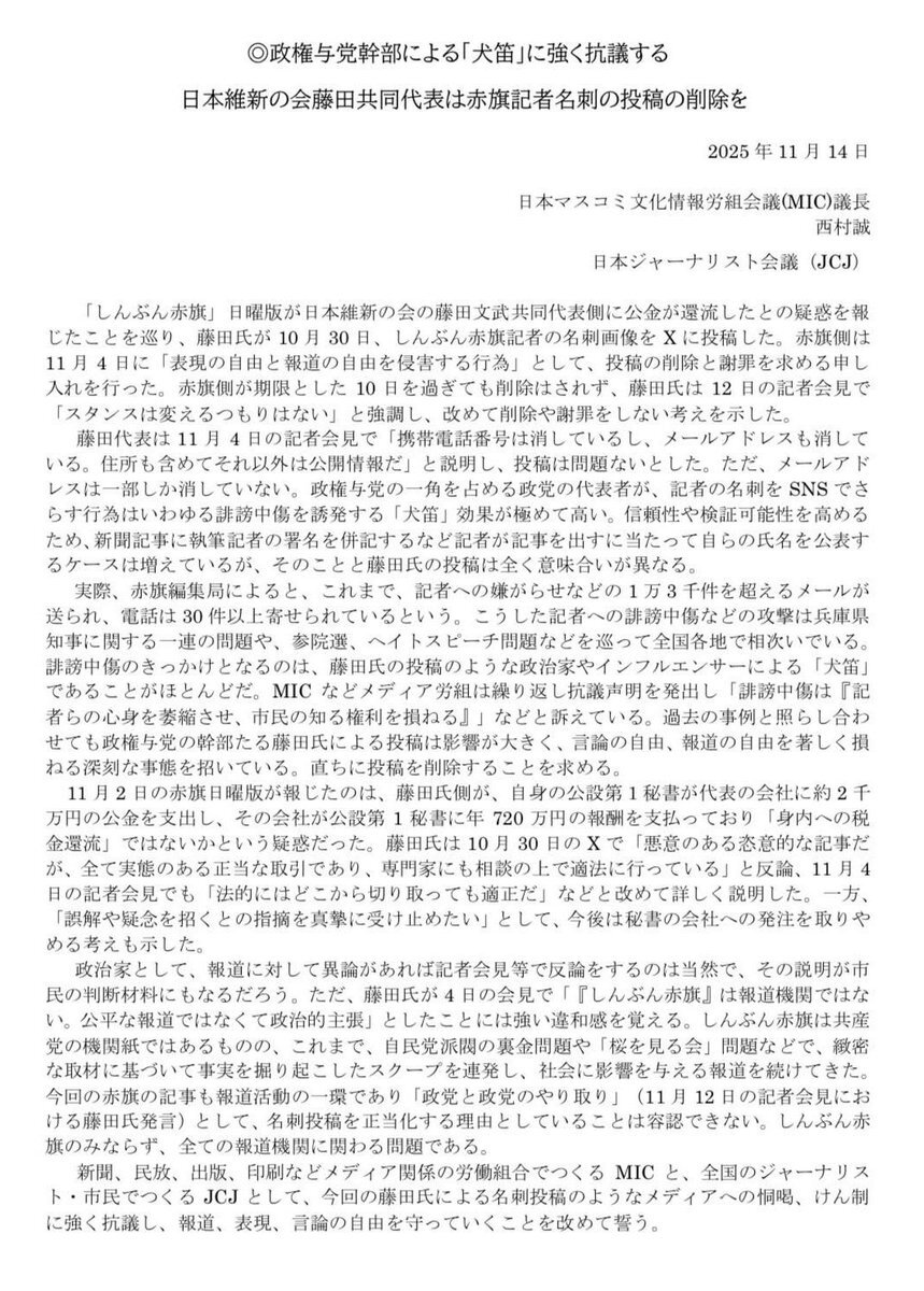 これは #日本維新の会#日本共産党 の石合戦などという問題ではない。言論・表現の自由という、民主主義社会において極めて重大な人権問題なのだ。 私は表現者の1人として #MIC #JCJ の声明に強く賛同します。 #日本マスコミ文化情報労組会議 #日本ジャーナリスト会議 #しんぶん赤旗 pic.x.com/2njaaKb76c
