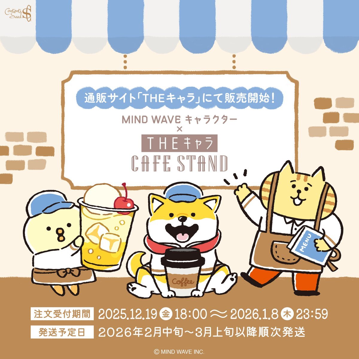 ■INFO■ 『#マインドウェイブ キャラクター×THEキャラ CAFE STAND』 🛒 #ザッキャラカフェ 通販サイトにて、事後通販がスタート(=| ´ㅅ` |=)〈ฅ`ᴥ´ฅ〉(・8・)☕🥤 📅 12/19(金)18:00 ~ 2026/1/8(木)23:59 🔗 the-chara.com/view/search?se… #ごろごろにゃんすけ #しばんばん #ぴよこ豆 #mindwave pic.x.com/GDsGDOJ1j3