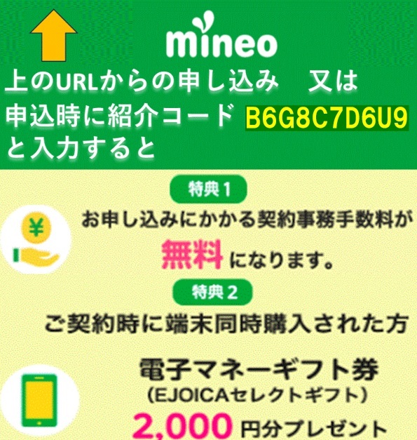 . 先日も「無料申込み」ありがとう❤ ※以下からの申込みで事務手数料3,300円が無料に ⇩ mineo.jp/syokai/?jrp=sy… ※又は、申し込み時に紹介コード「B7E5C9Z3H1」と入力 ※端末同時購入で2,000円分の電子マネーギフトが貰える #mineo #紹介コード #マイネオ !!!!!!