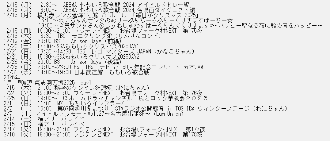 週間予定(12/15-21) ■12/17(水)25:00-27:10 [再]しおこうじのお台場フォーク村 (フジテレビNEXT) 第152夜 しおこうじ音楽特別番組 − うたでひとつになろう日本 − ※ゲスト: 木村充揮 橋口洋平(wacci) サンタラ Negicco TSH&I(寺尾、砂田、平松と伊藤) #alfee #momoclo #フォーク村 pic.x.com/0Gr5TqcPCO