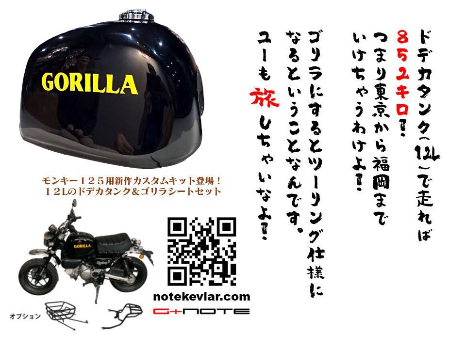 ゴリラタンク12L&ゴリラシートのセット!! 852Km(ホンダ公式燃費71Km/L × 12L)の走行が可能になります。ゴリラシートもツーリングを意識したつくりになっています。 notekevlar.com/products/goril… #Monkey #モンキー125 pic.x.com/e1sj4x3MHY