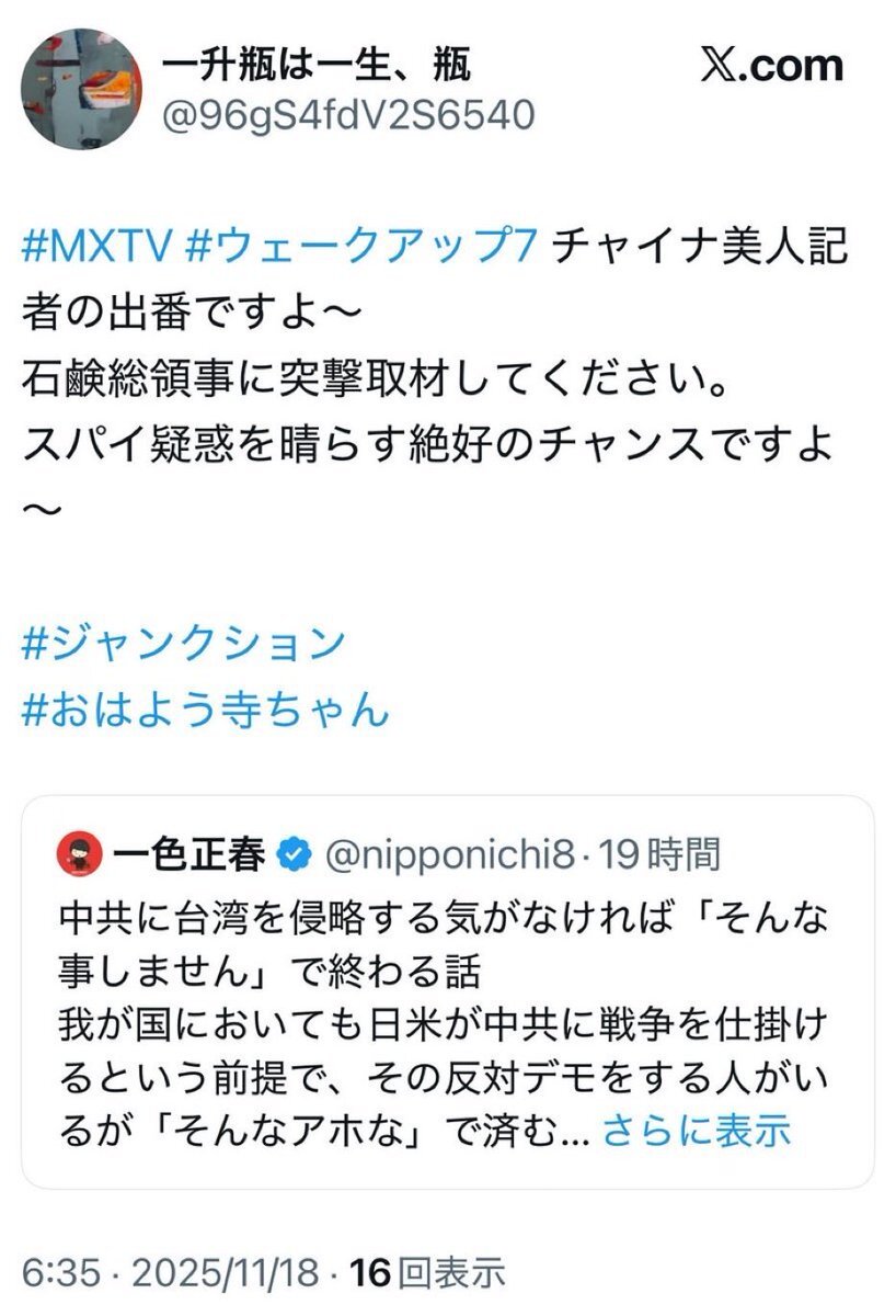 「中国人記者」だけで無く、気に入らない日本人にもスパイレッテル。 ホンモノのスパイには全く無力な右層。 @96gS4fdV2S6540 #一升瓶は一生瓶 #MXTV #ウェークアップ7 #ジャンクション pic.x.com/iuMrQ1JARq