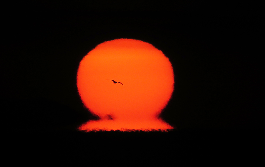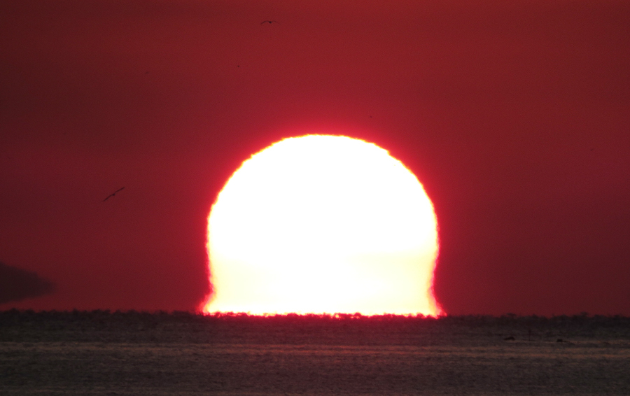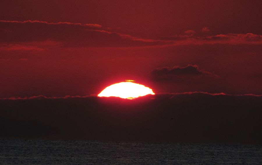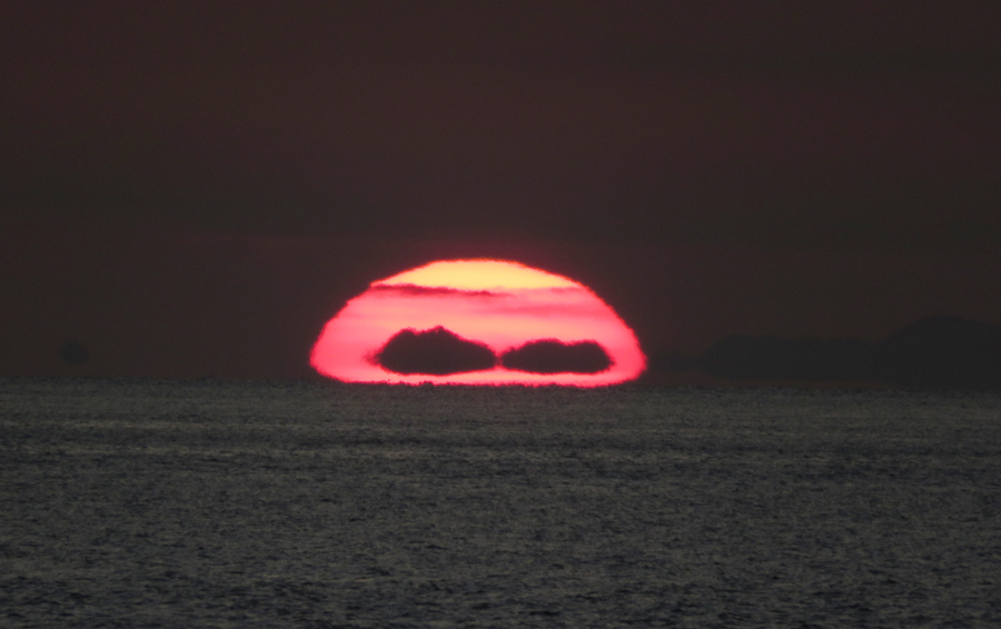 酷道378号線の八幡浜真網代-西予市三瓶間では 対岸の九州が低空にかかるので #だるま夕日 の地形での日没の夕日の時間形態 その2(時期や撮影場所は別)。・・・ Ω夕日 タコさん夕日(with鳥) タコさん夕日 サングラス夕日 #大気光学現象 #mysky pic.x.com/XBE8FaB0WG