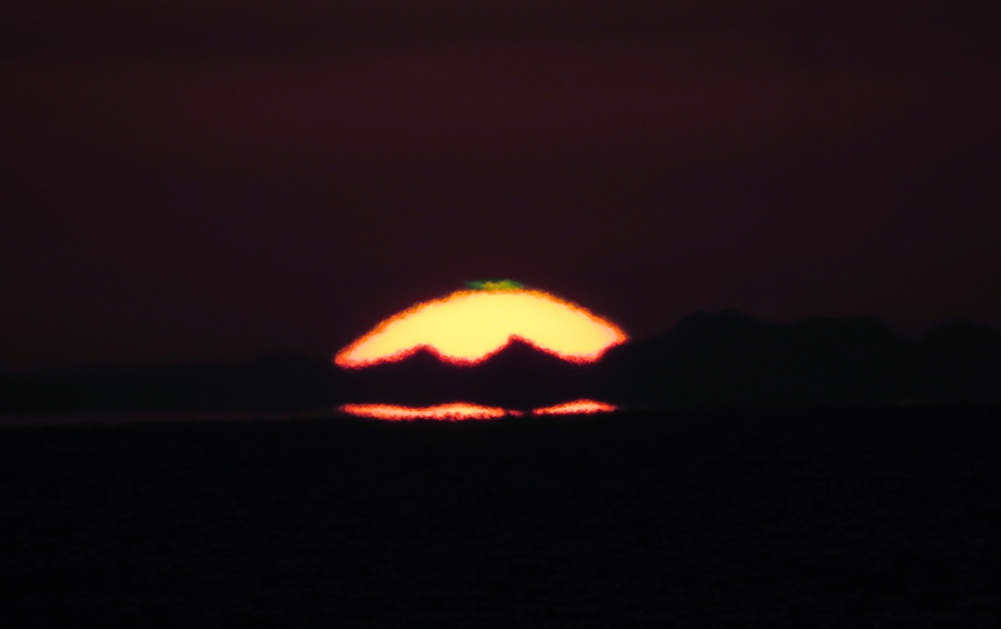 酷道378号線の八幡浜真網代-西予市三瓶間での 日没の夕日の上部の緑閃光(グリーンフラッシュ)4態 (時期や撮影場所は別)。・・・ #大気光学現象 #mysky pic.x.com/LoVtXEIars