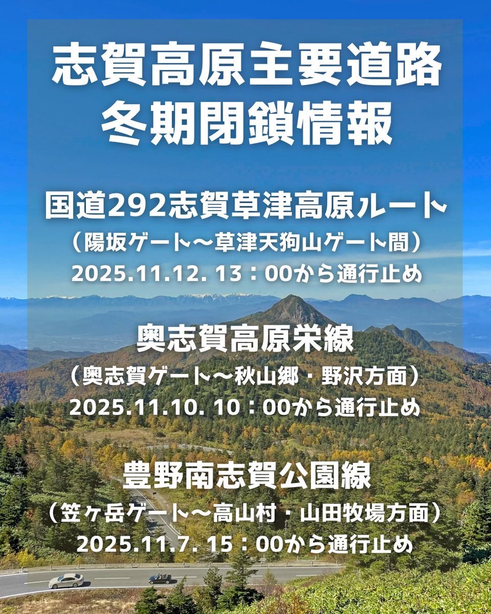 まだまだ紅葉真っ盛りですが🍁 今シーズンの志賀高原主要道路の冬期閉鎖日程が発表されました🛣️ いよいよ冬が近づいてきましたね☃️ #国道292号 #志賀草津高原ルート # #紅葉 #志賀高原 #山ノ内町 #上信越高原国立公園 #shigakogen #hiking #nature #nationalpark #Autumn pic.x.com/zodgIu29xi