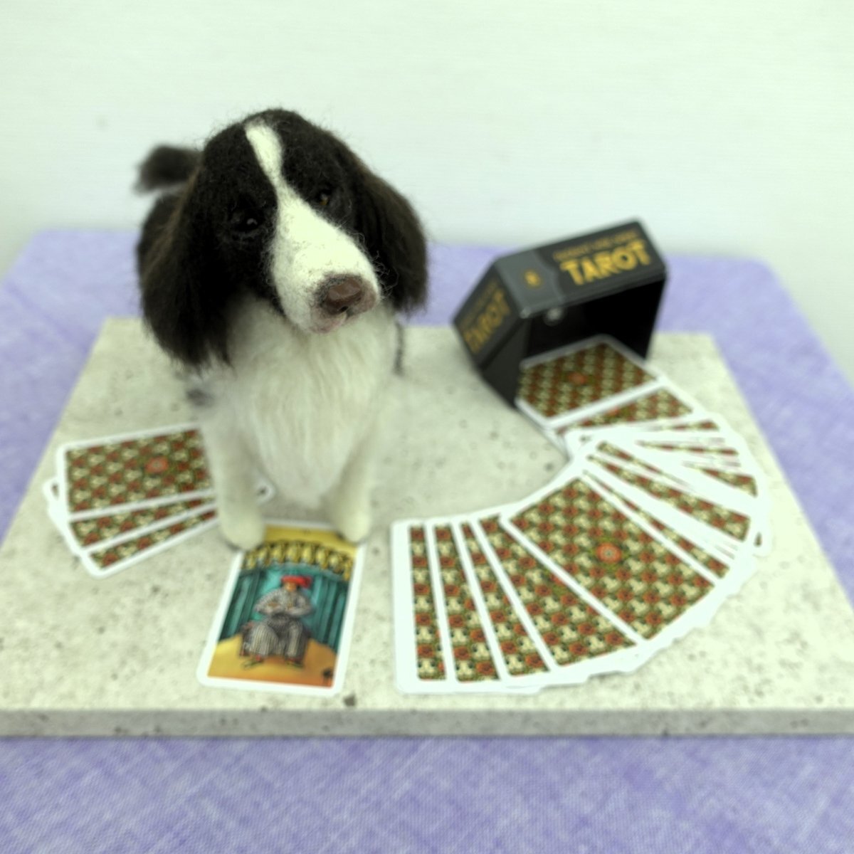#21世紀アートボーダレス展 国立新美術館で初出品です 12月6日まで(12/2休館日) いたずらしてひっくり返してしまったタロットカードでたまたま出たカードが「カップの9=ウィッシュカード」飼い主さんの願いが叶うというカードだったという設定 #FeltDogs #NeedleWork #羊毛フェルト #FeltAnimals pic.x.com/5jlwoccqGl
