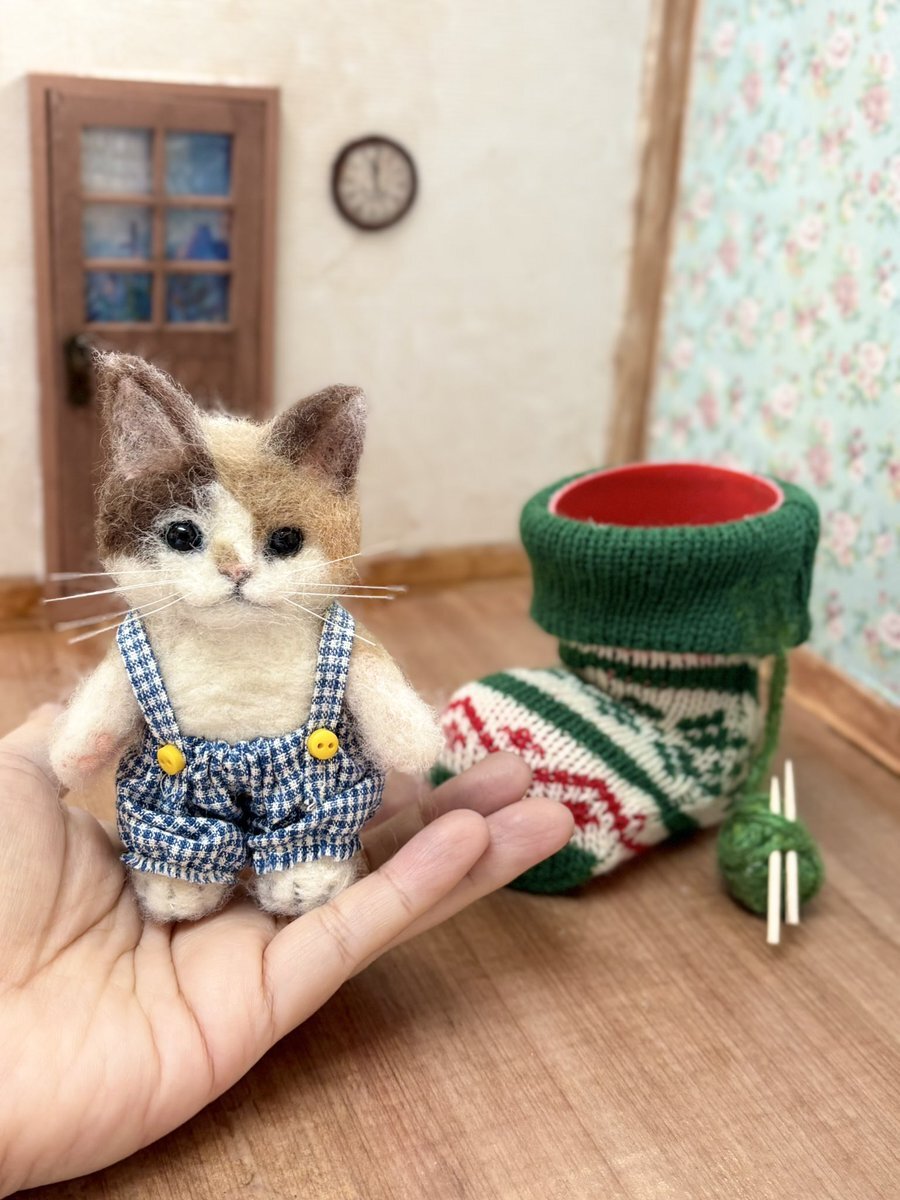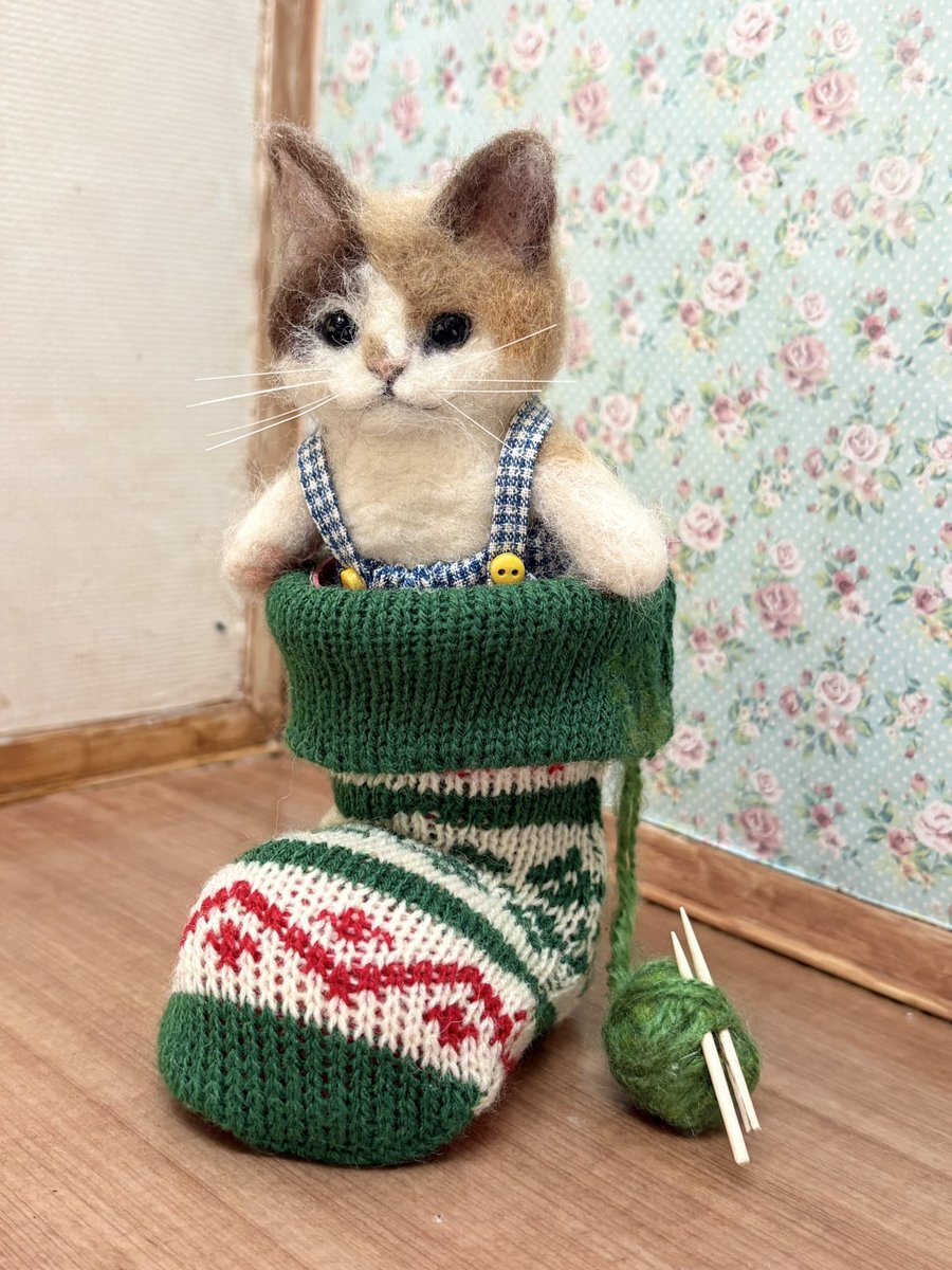 羊毛フェルトで クリスマスプレゼントが欲しくて 大きな靴下を作ってる三毛猫を製作しました # #羊毛フェルト #ニードルフェルト #ハンドメイド #needle #needlework #needlefelting #handmade pic.x.com/97hD7vQqpa