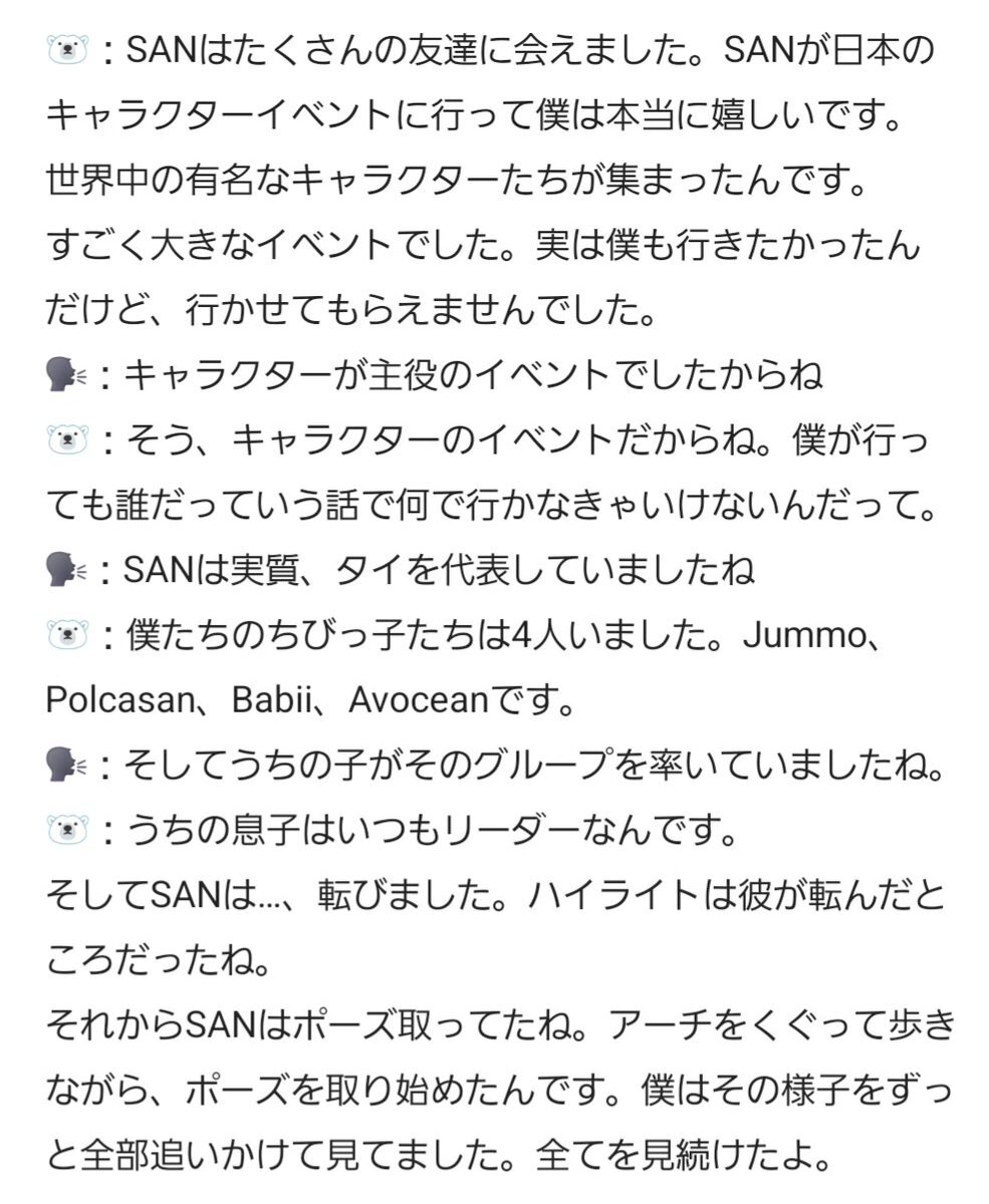 🐻‍❄️ San got to meet so many friends. I’m really happy because San went to a character event in Japan. They gathered famous characters from all over the world. It was a huge event. I actually wanted to go too, but they didn’t let me. 🗣️ Because it was a