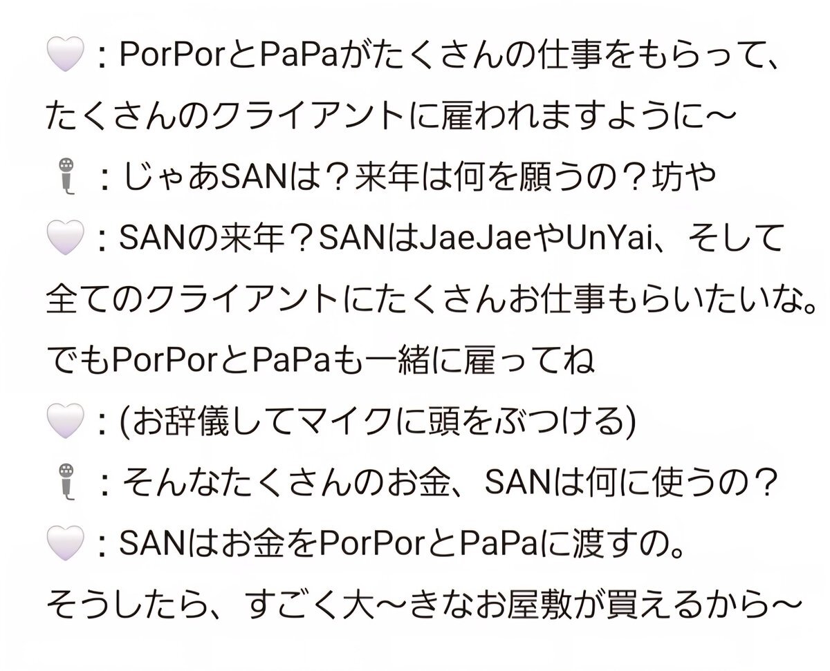 🐳🐻‍❄️ I hope PhorPhor and Papa get lots of work and have many clients hiring them~ 🗣️ And what about you, San? What do you wish for next year,sweetie ? 🐳🐻‍❄️ For San next year? San hopes the Je-jehs, the Grandmas, and all the clients will hire San a lot