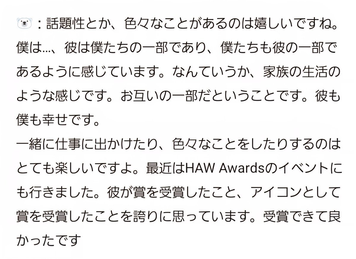 🗣️ Do you ever feel upset that your son is getting so many jobs? 🐻‍❄️ Not at all. I don’t think about it that way. I see San as real family. Whenever we meet or talk, I always ask San, “Did you have fun, San? How was work today, sweetie ?” It’s never