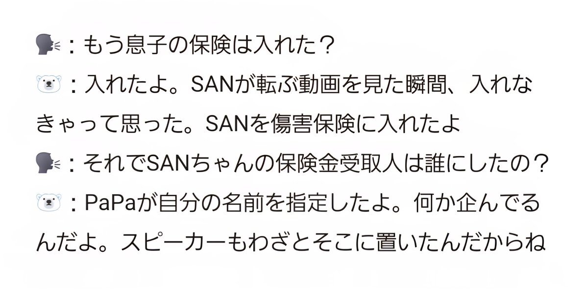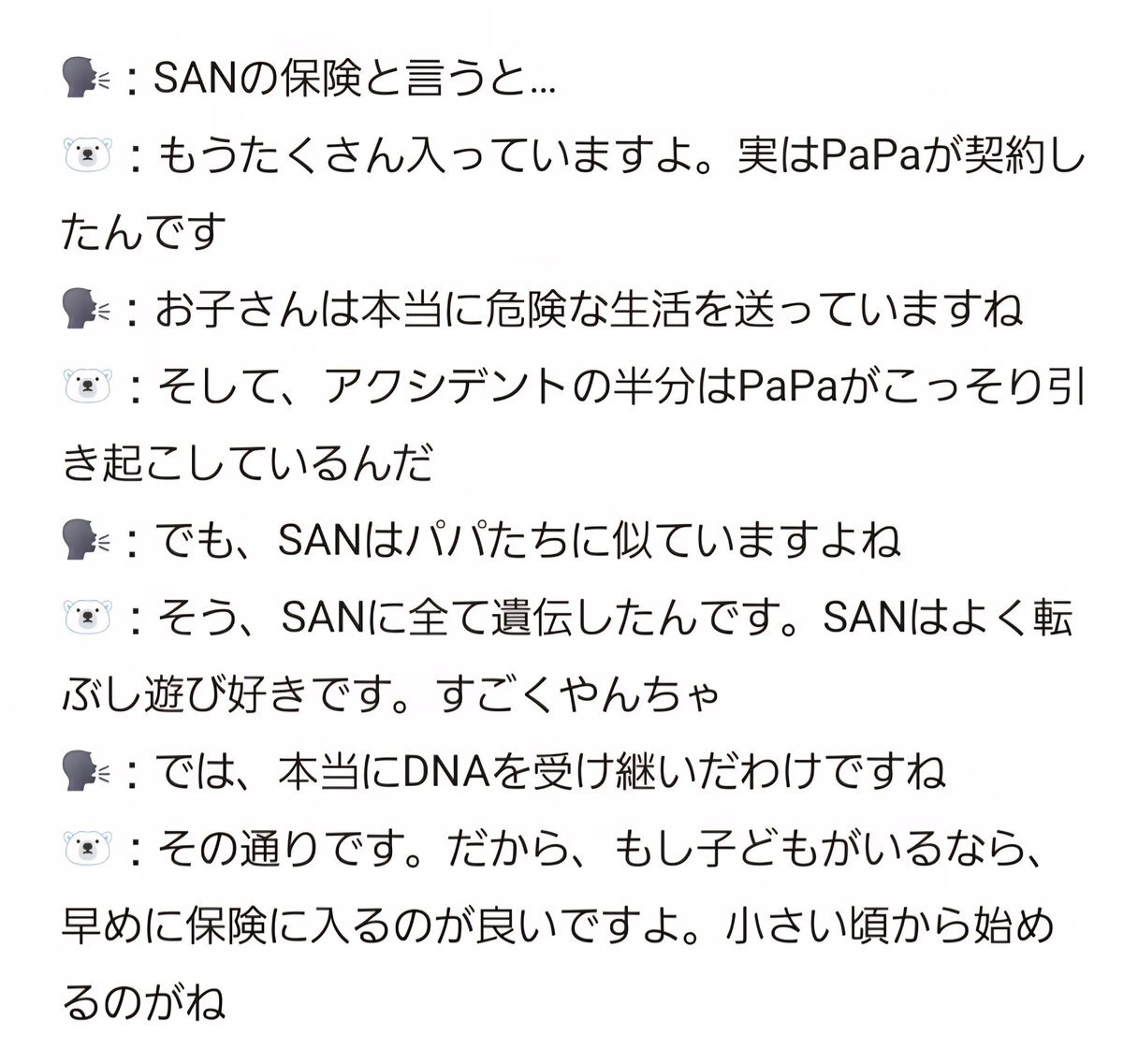 🗣️ Speaking of San’s insurance… 🐻‍❄️ We got plenty already. Actually Papa is the one who bought them. 🗣️ Your kid really lives a dangerous life. 🐻‍❄️ And Papa’s also the one secretly causing half the accidents. 🗣️ But San takes after his dads too. 🐻‍❄️