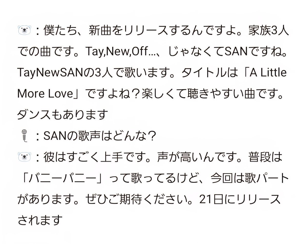🐻‍❄️ we’re releasing a song. It’s a song as a family of 3. There are Tay, New, Off. Oops, no, San. There are Tay, New, San. 3 of us sing it. They said the name is “A Little More Love”, right? It’s fun and easy to listen to. It has dance moves too. 🎤 how does San sing? 🐻‍❄️ he sings x.com/nukcyn/status/…