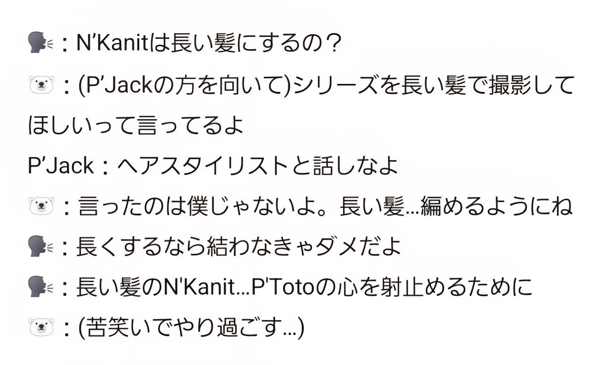 🗣️ Will N’Kanit have a long hair? 🐻‍❄️ (turns to P’Jack) They said they want me to film the series with long hair. P’Jack: Talk to the hairstylist. 🐻‍❄️ I’m not the one who said it, okay. Long hair… so it can be braided. 🗣️ If it’s long, you’ll have to tie