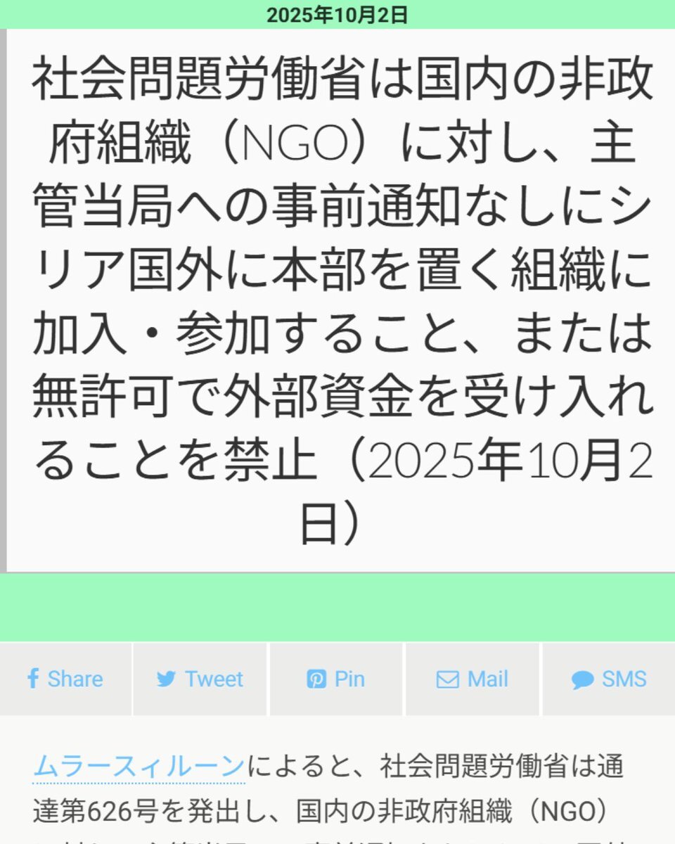 社会問題労働省は国内の非政府組織(NGO)に対し、主管当局への事前通知なしにシリア国外に本部を置く組織に加入・参加すること、または無許可で外部資金を受け入れることを禁止(2025年10月2日) #シリア #NGO syriaarabspring.info/?p=124999 pic.x.com/fKoMSyBF5X