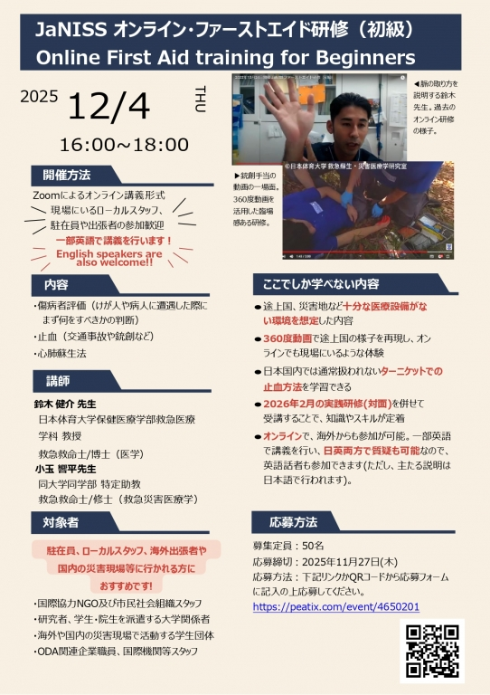 \📢#KNC加盟団体からのお知らせ🔔/←他の情報もぜひ! 🌟ファーストエイド #研修(初級・オンライン) 📌#NGO 安全管理イニシアティブ(JaNISS) 📆12/4㈭16:00-18:00 📍オンライン 💰メンバー団体1800円~ #救急救命 #国際機関 #ODA 詳細は下記リンクよりご確認を👇✨ kansaingo.net/information/ev… pic.x.com/o8IEuYAYFZ