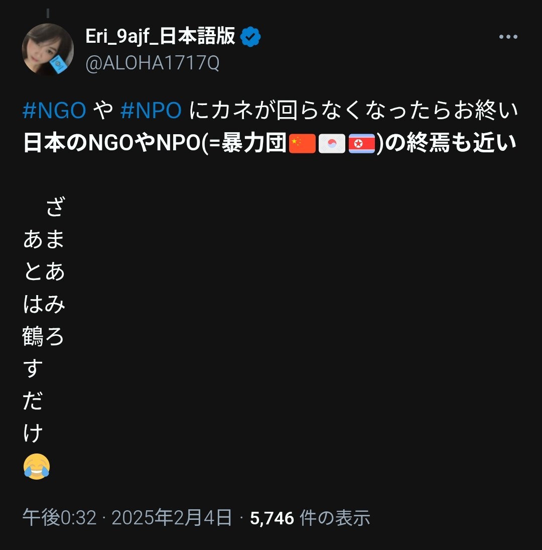 #NGO や #NPO にカネが回らなくなったらお終い 日本のNGOやNPO(=暴力団🇨🇳🇰🇷🇰🇵)の終焉も近い ざ あま とあ はみ 鶴ろ す だ け 😂 x.com/ALOHA1717Q/sta…