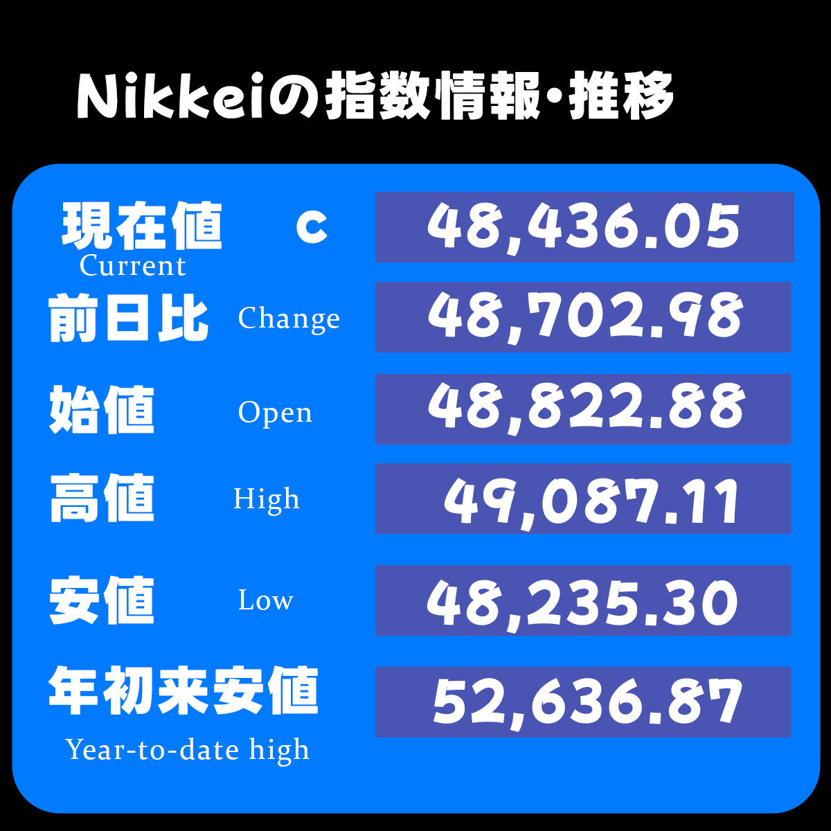 📊 日経平均の最新動向 現在値は 48,436.05。高値・安値も更新しながら、相場は依然として高水準をキープ!🚀🇯🇵 #日経平均 #日本株 #株式市場 #Nikkei #StockMarket #Investing pic.x.com/9HozrJgGXn