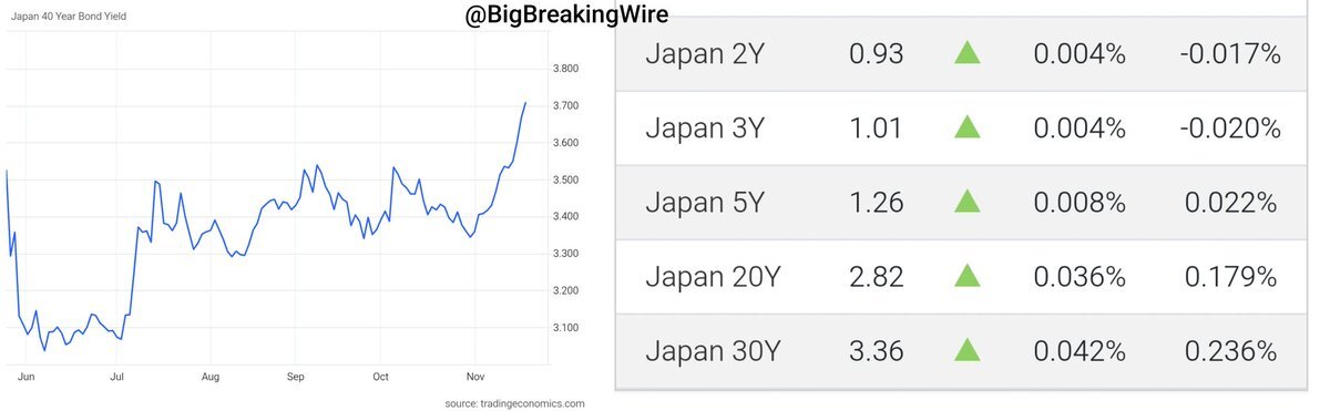 日本国債利回りが急伸。40年債は過去最高の3.7%、30年債は3.36%。20年債は2.82%で1999年6月以来の高水準。2年0.93、3年1.01、5年1.26と短期も上昇。市場は20兆円超の景気刺激策を織り込んでいると共同通信報道。 #Nikkei #Japan #USDJPY $SPY $SPX $QQQ x.com/BigBreakingWir…