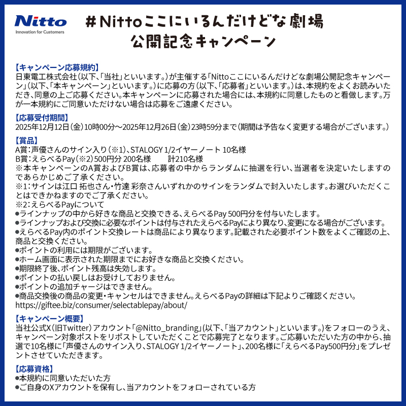 ▼応募規約は画像をご参照ください ※本投稿のみをリポストの場合は対象外ですので、上記キャンペーン投稿をリポストください。 #江口拓也 さん #竹達彩奈 さん の演じる #Nitto ( #日東電工 )製品が登場する #Nittoここにいるんだけどな劇場 本編はこちらから☟ 特設サイト nitto.com/jp/ja/kokogeki/ pic.x.com/ZJVayjEwlY