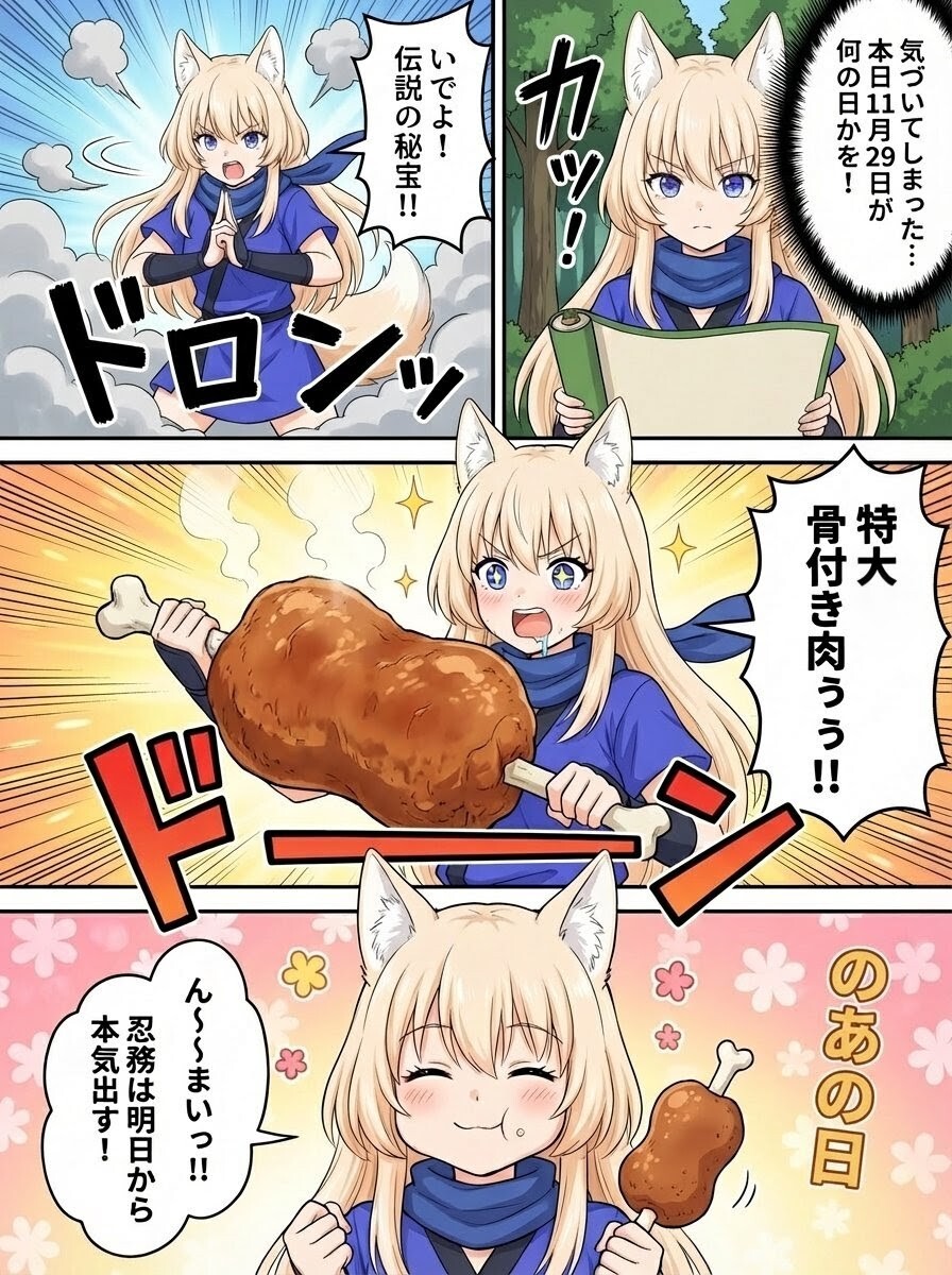 毎月29日は #NOAの日 ✨ それに合わせてAI利用可能なのあちゃんイラストも公開👀🙌 11月29日=いい肉の日、がうまく表現できませんでしたが、4コママンガにチャレンジしてみました!😆 ※けいすけさんのスマホバナナを利用 #NOArt pic.x.com/MqMbhZseOm x.com/akezima_d/stat…
