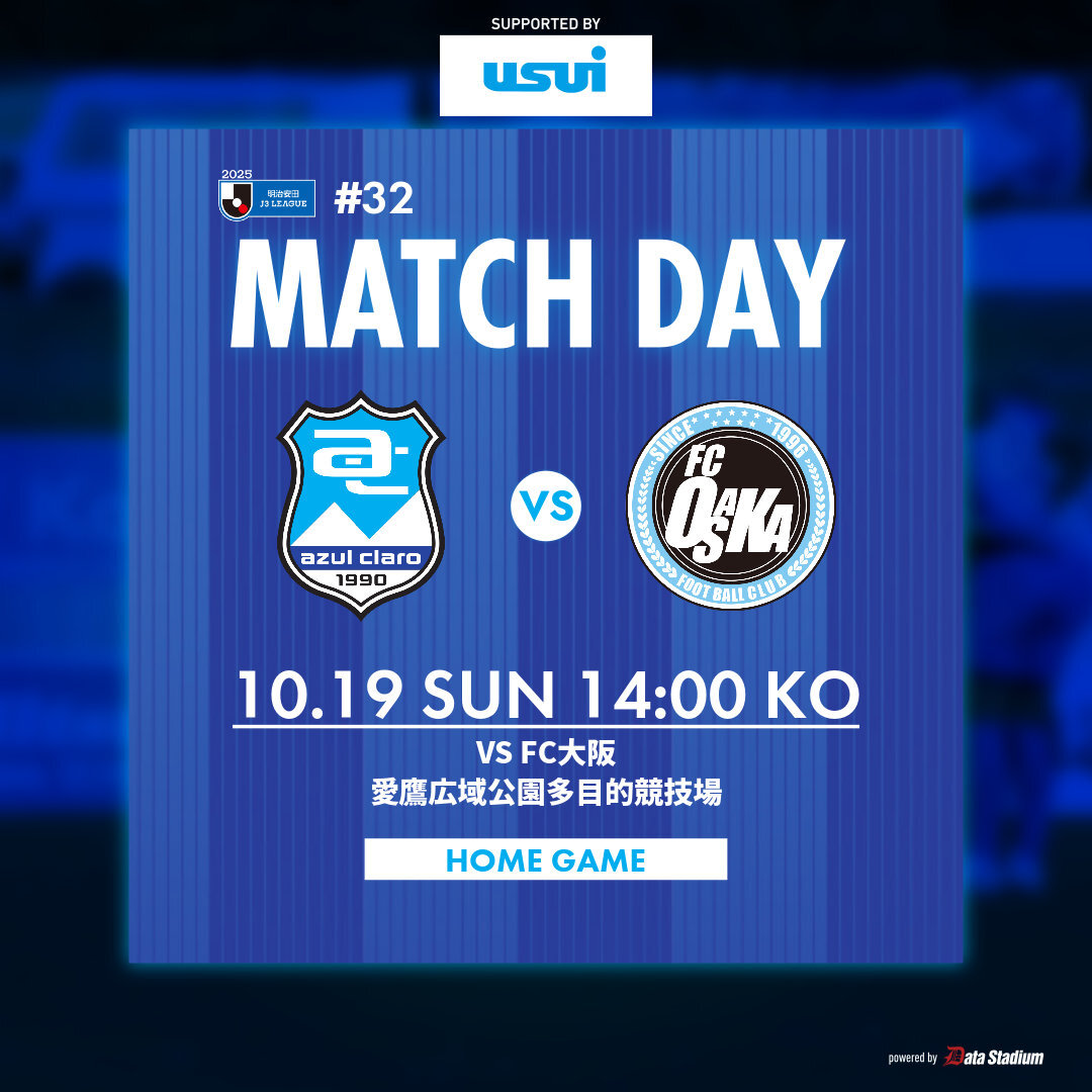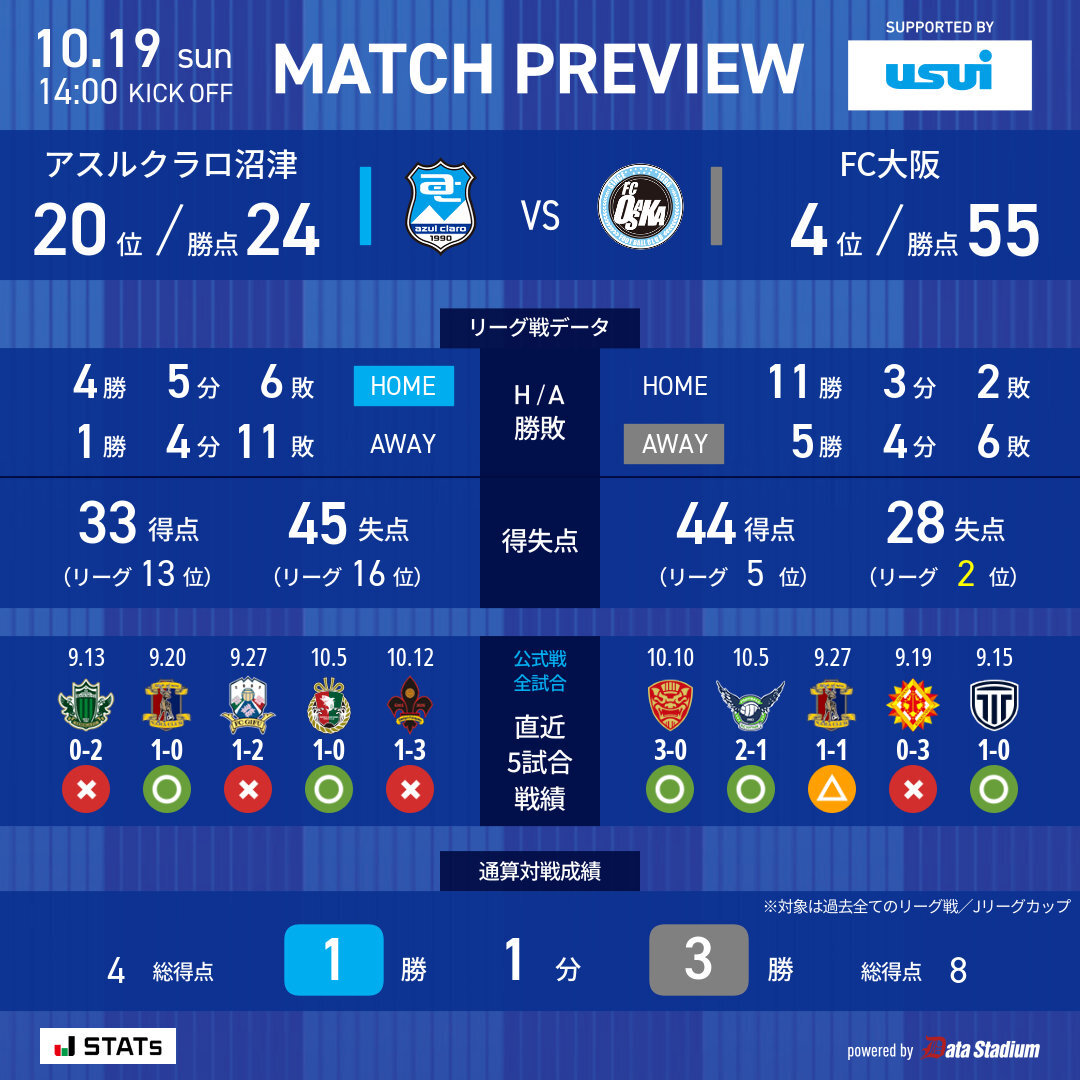 📊 | MATCH PREVIEW 🏆明治安田J3リーグ 第32節 🆚#FC大阪 🗓 10/19(日)14:00Kickoff 📍愛鷹広域公園多目的競技場 🖥️DAZN[onl.tw/yT6Cuwj] #アスルクラロ沼津 #結束~全力で闘え~